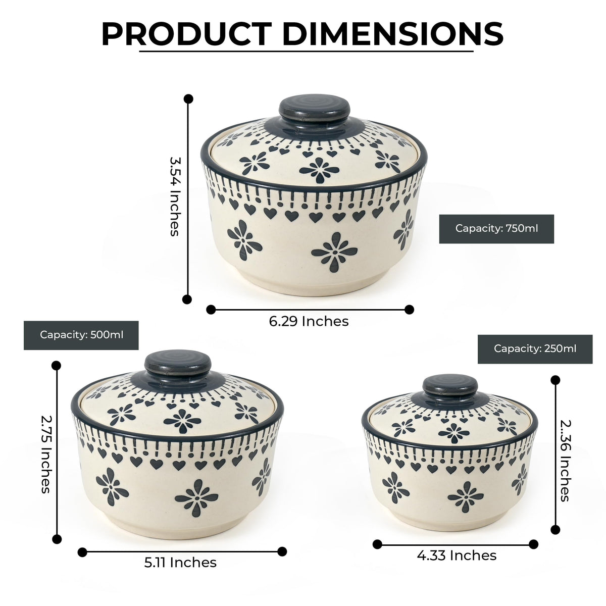 Shadowgreen- Ceramic Serving Donga Set With Lid - Gravy Donga Set - Dinner Bowl With Lid - (Set Of 3-750Ml 500Ml 250Ml) (Grey Jhallar Design)