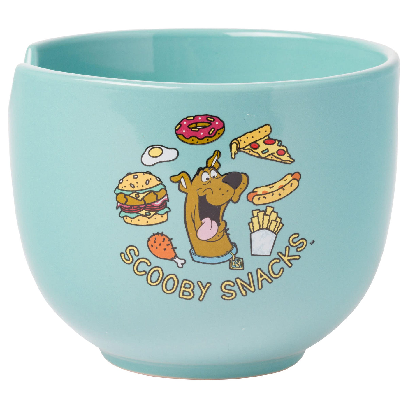 • Q: What design features does the bowl have? A: The bowl features an image of Scooby-Doo with his favorite foods and the text 'Scooby Snacks' written in yellow.