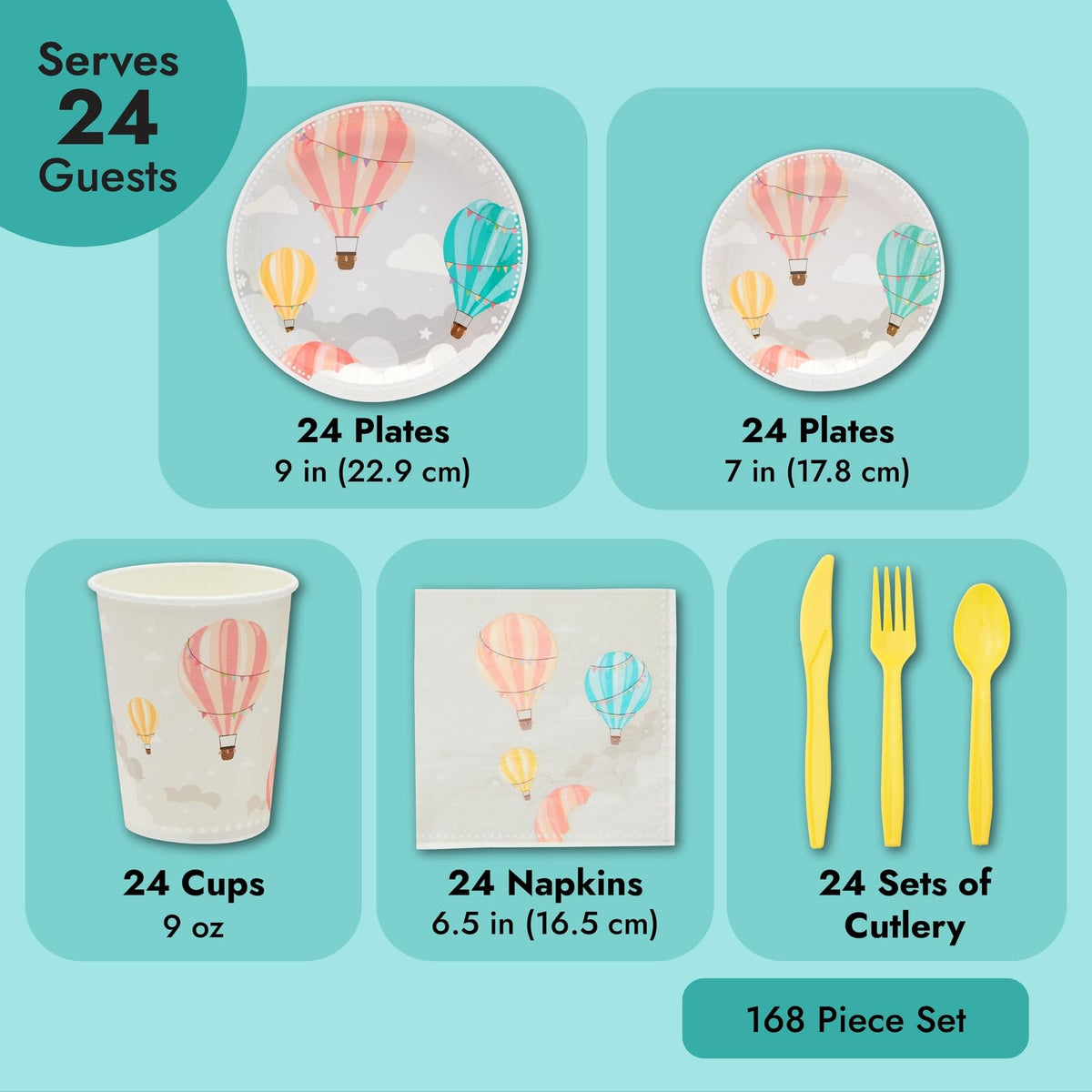 - Q: What is included in the Sparkle and Bash Hot Air Balloon Party Decorations set? A: The set includes 24 hot air balloon plates, party cups, dinner napkins, plastic knives, spoons, and forks, totaling 168 pieces, which serves up to 24 guests.