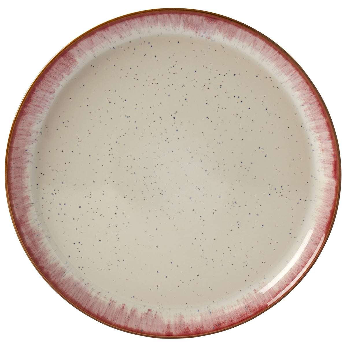 - Q: What type of design does the dinnerware set feature? A: The dinnerware set features a speckled design with a light berry red brush glazed rim, adding a sophisticated touch to your table setting.