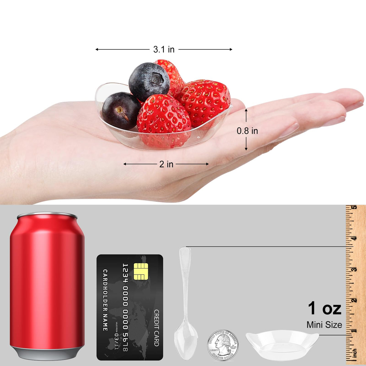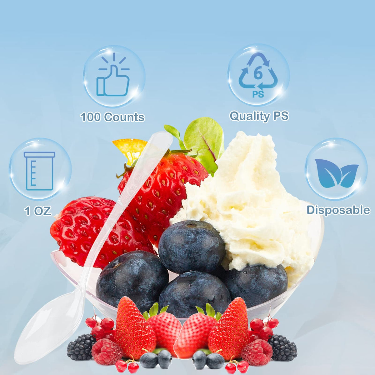 TOFLEN 100ct 1 oz Mini Dessert Plates with Tasting Spoons - Reusable Clear Plastic Party Serving Trays Mini Plates for Appetizers Chocolates Ice Cream Fruit and More