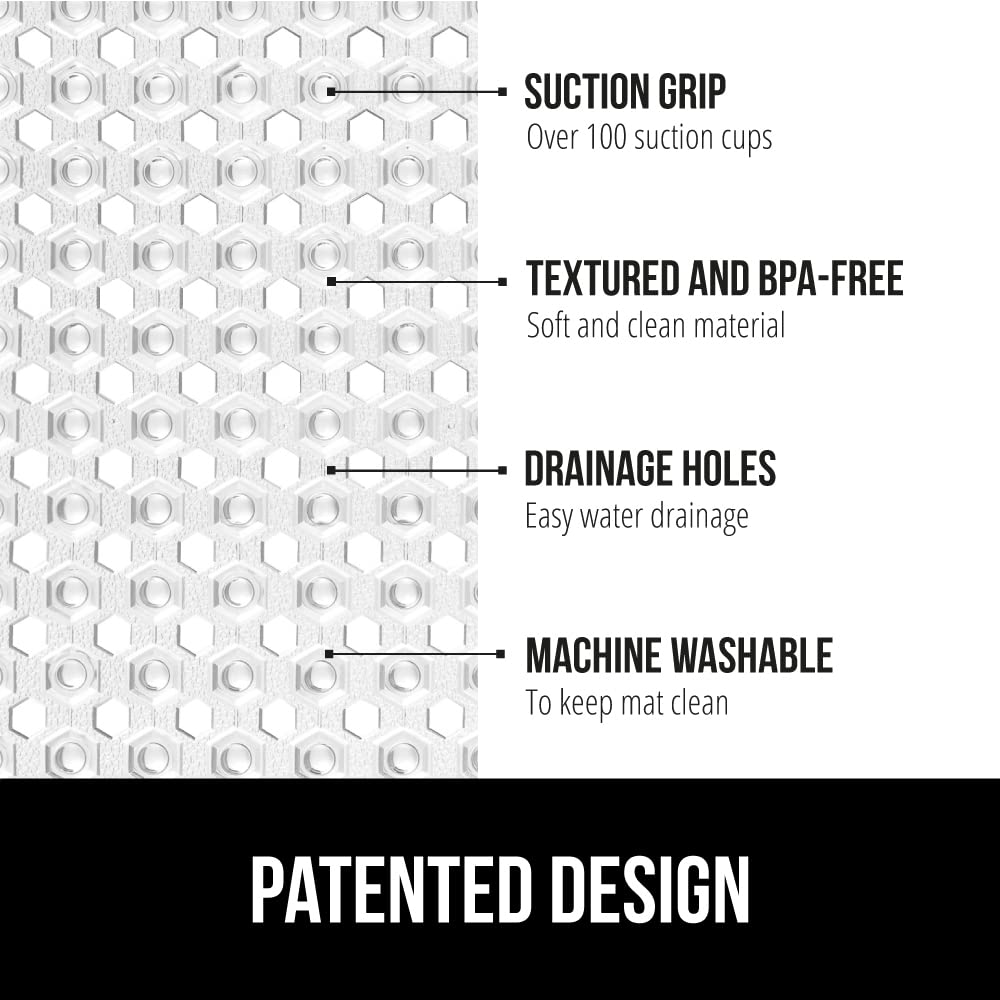 - Q: What features make this mat stand out from others? A: The Gorilla Grip Shower Mat features a patented design with powerful suction cups, easy drainage, textured surface, and is machine washable, making it a practical choice for any bathroom.