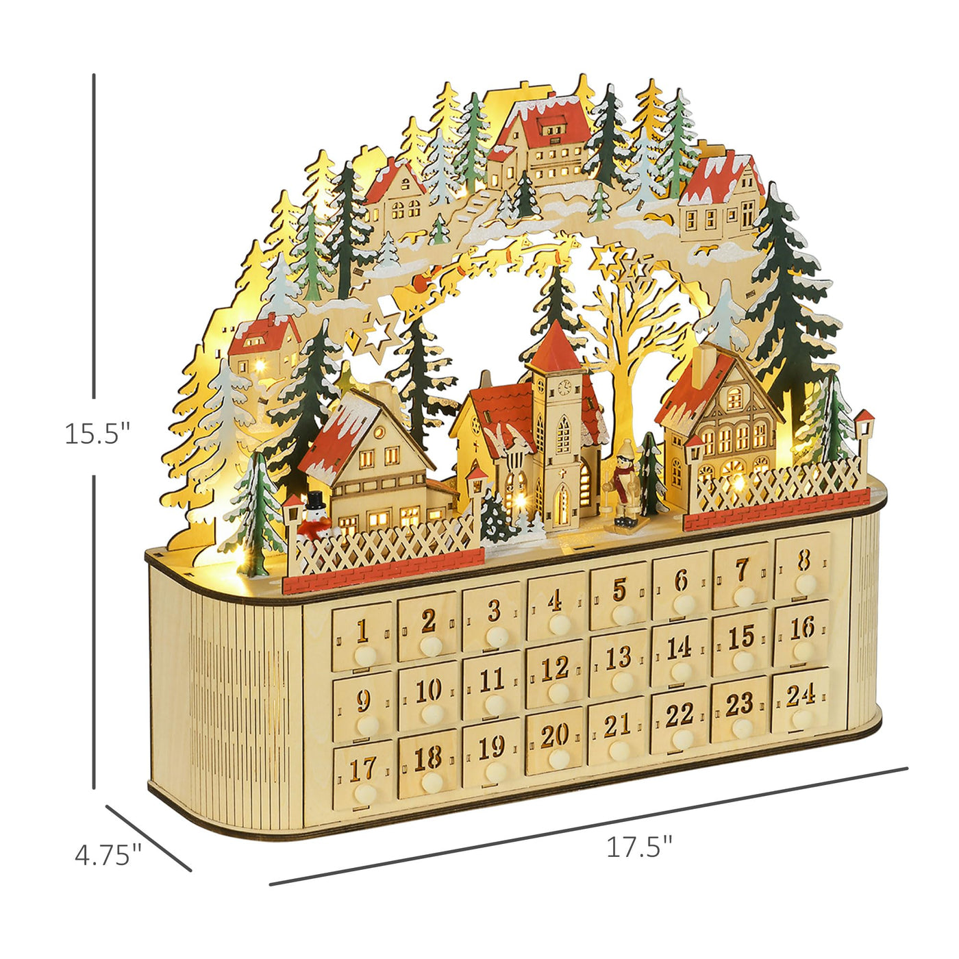 Description:Decorate a holiday table with this 24 days of Christmas advent calendar by HOMCOM. A practical decoration; put notes and candies in the little drawers and allow your children to open a single drawer daily. With Christmas quickly approaching and a surprise every day, theyll have an extra source of holiday cheer. Unlike the traditional chocolate calendar, a reusable calendar can be a healthy advent calendar with healthier options inside to create a fun holiday year after year.Features:? 2-in-1 Christmas advent calendar, and light up Xmas decoration ? Shape: arched top. Type (pattern): the red roof houses, trees, skating child, snowman, and Santa riding on the sleigh pulled by reindeer ? Built-in LED lights to light up the Christmas scene ? 24-day countdown drawer allows you to stow notes and treats for everyday surprises and fun ? Suitable for a home office, table, mantle, desk, or fireplace ? Reusable design, saving budget while having year after year fun ? A reusable design also allows healthier options ? Pre-assembly design saves you timeSpecifications:? Color: Natural Wood Color ? Material: MDF ? Overall Dimensions: 17.5 W x 4.75 D x 15.5 H ? Drawer Dimensions: 1.5 W x 1.25 D x 1.25 H ? Light Count: 20 ? Battery: 3 x AA Battery (Not Included) ? Item Label: 830-741V80NDPackage Includes:? 1 x Christmas Advent Calendar ? 1 x Manual