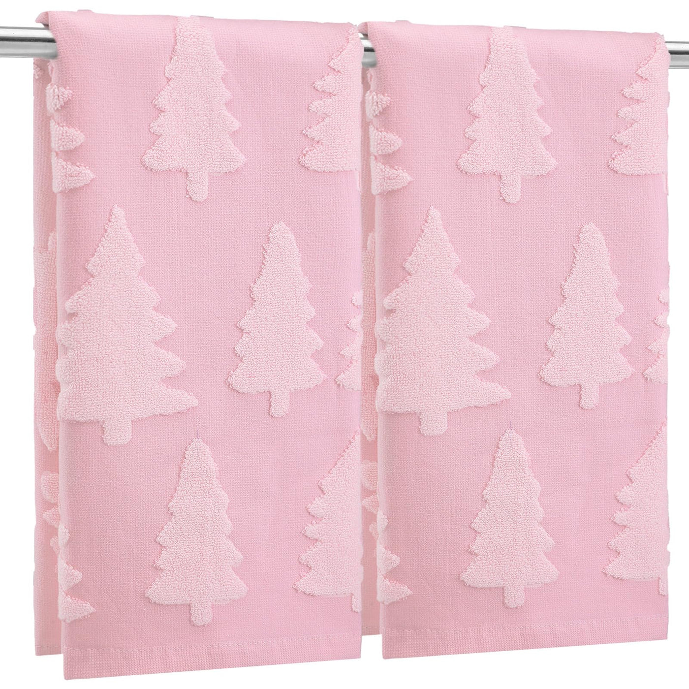 Breling 2 Pcs Christmas Hand Towels Pink Christmas Trees Bathroom Decorative Towels 100% Cotton Absorbent Jacquard Weave Bath De