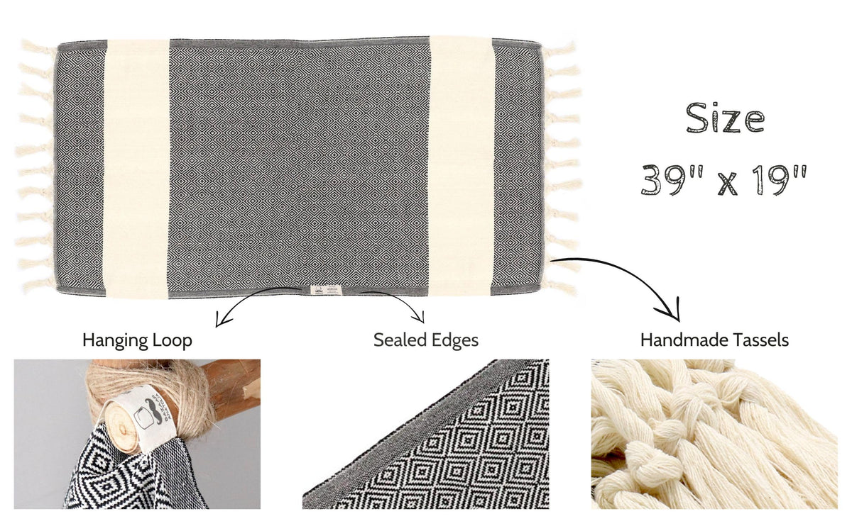 • Q: What are the dimensions of the Bazaar Anatolia Turkish Hand Towels? A: The Bazaar Anatolia Turkish Hand Towels measure 39x19 inches each.
