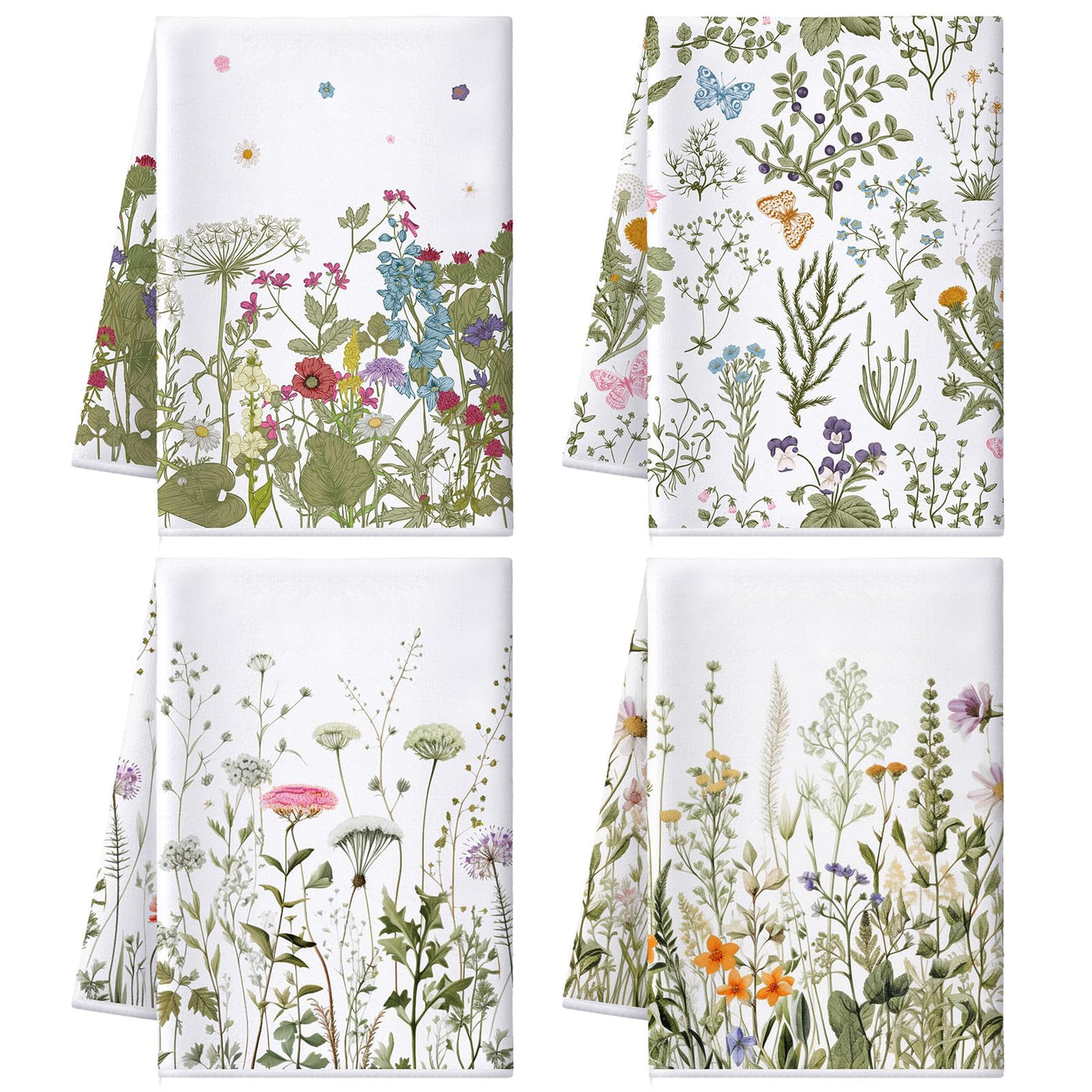 Bencailor 4 Pcs Wild Flower Kitchen Towels Wildflower Floral Hand Dish Towels White Green Leaves Dishcloths Fast Drying Decorati