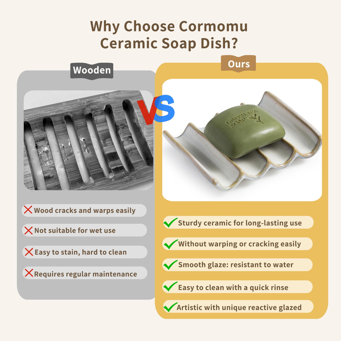 - Q: What colors are available for this soap dish? A: The Cormomu Soap Dish comes in multiple color options, allowing you to choose one that complements your bathroom or kitchen decor.