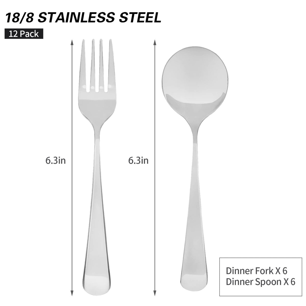 • Q: How many pieces are included in this set? A: The set includes a total of 12 pieces: 6 dinner forks and 6 dinner spoons.