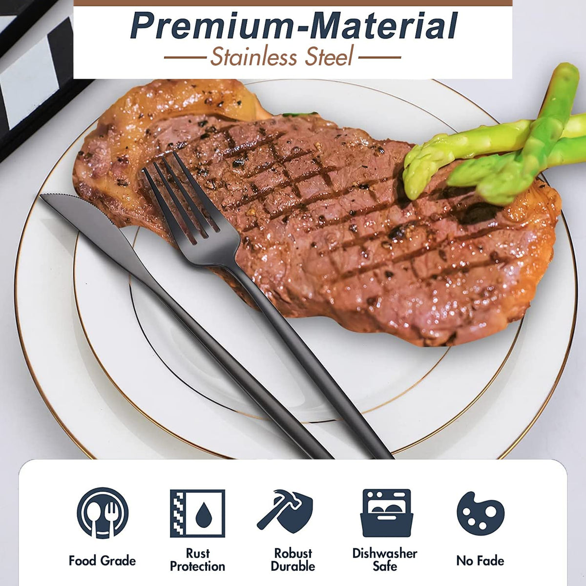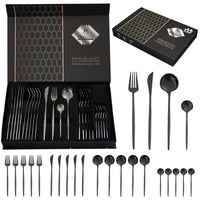 - Q: What materials are used in the 24-Piece Black Silverware Set? A: The 24-Piece Black Silverware Set is made from high-quality stainless steel, ensuring durability and resistance to rust.