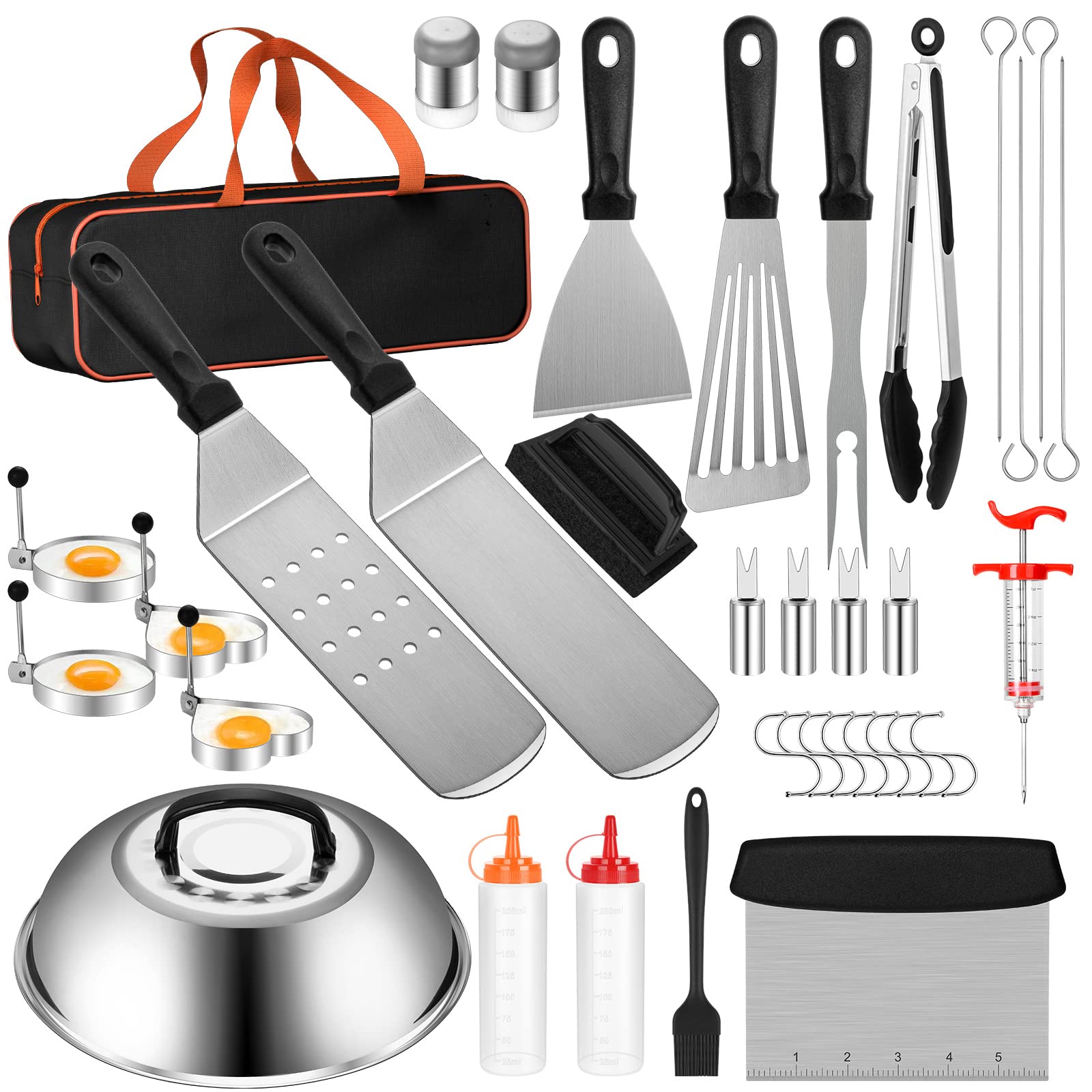 - Q: What items are included in the 37-piece griddle accessories kit? A: The kit includes a spatula, slotted spatula, scraper, chopper, fish turner, grill fork, grill tongs, basting cover, sauce brush, meat injector, cleaning brushes, a carry bag, hanging hooks, skewers, egg rings, corn holders, spice shakers, and squeeze bottles.