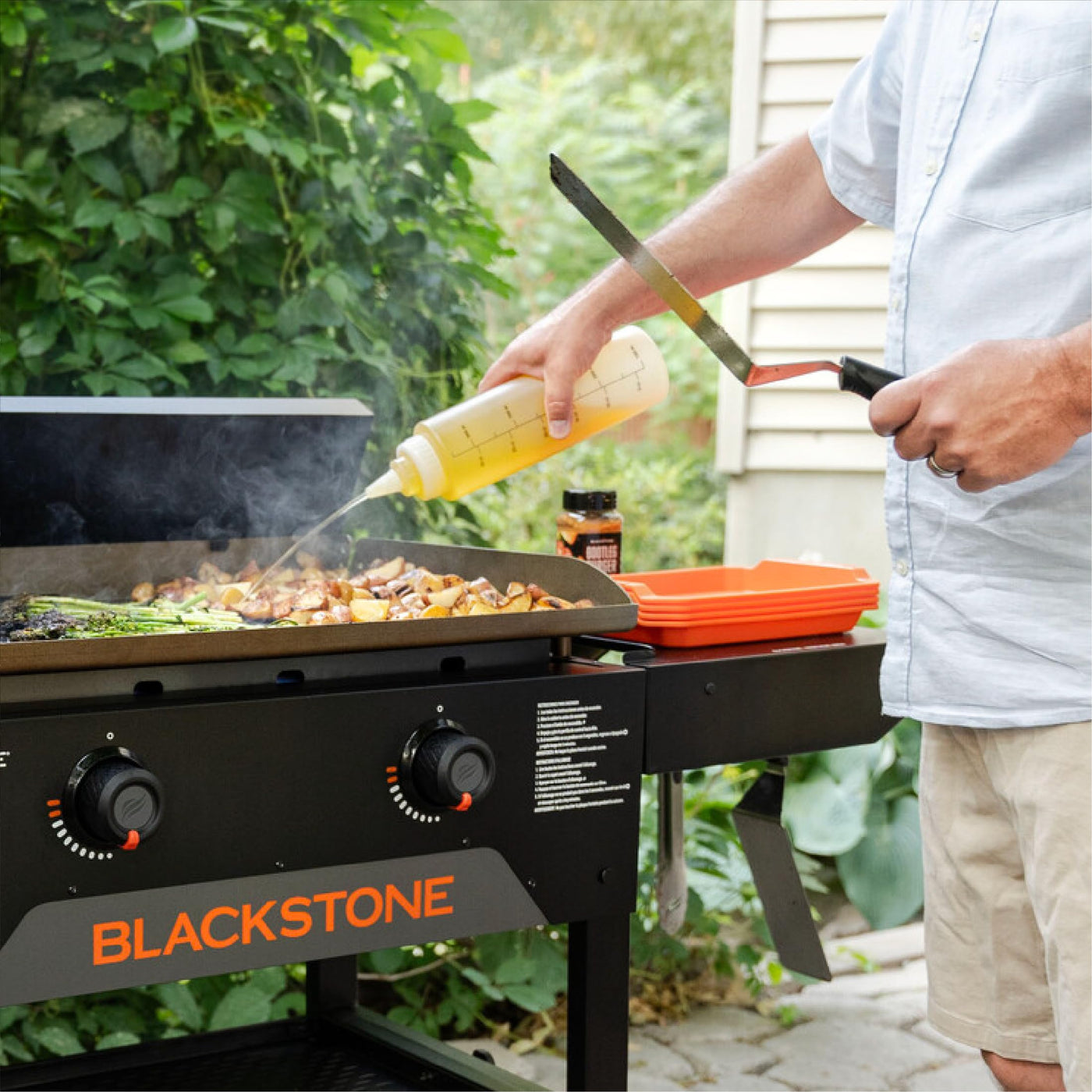 • Q: What materials are the Blackstone squeeze bottles made from? A: The bottles are made from plastic, making them lightweight and easy to handle during cooking.
