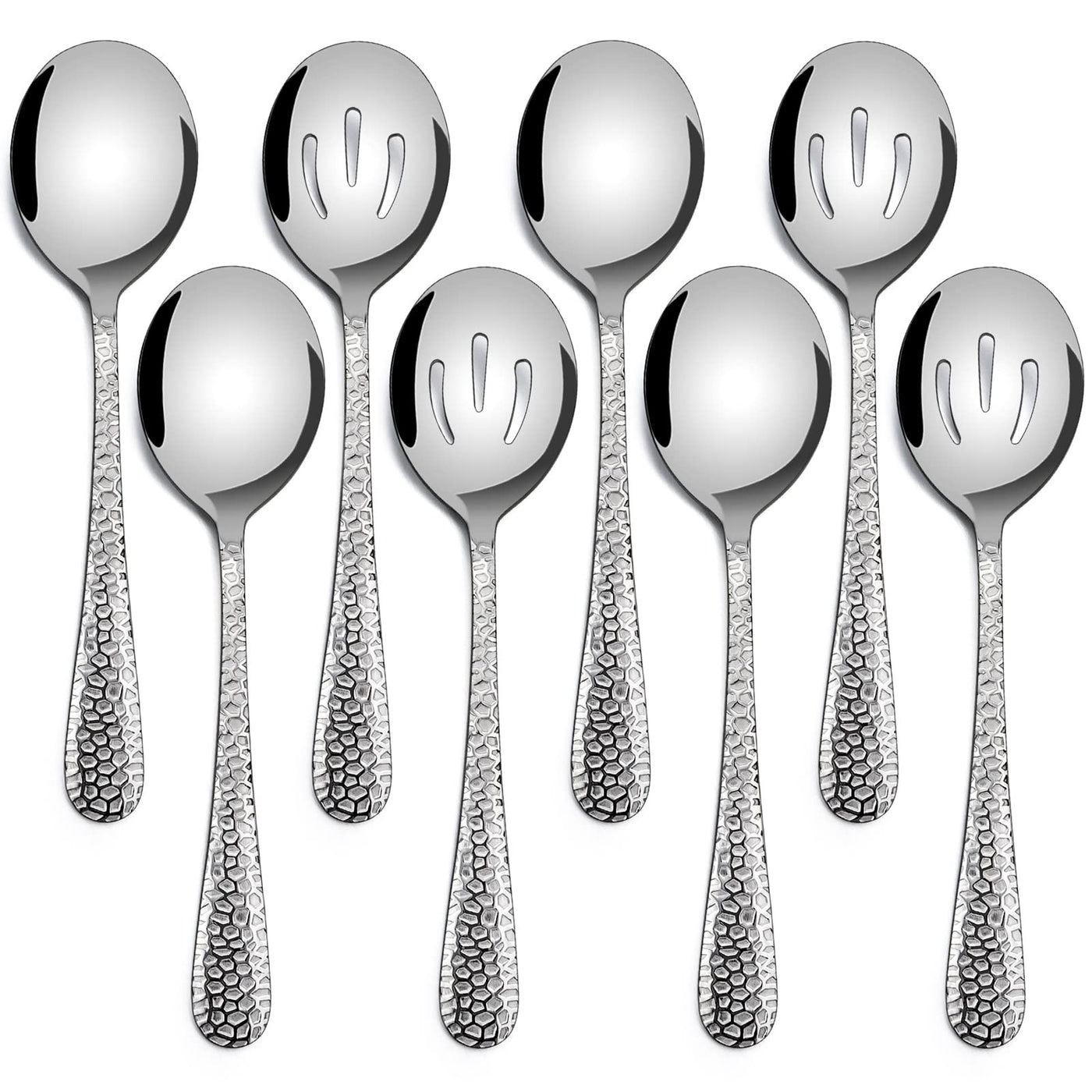 Hammered Serving Spoons, E-Far 8-Piece Metal Serving Utensils Set - Solid Spoons X 4, Slotted Spoons X 4, Stainless Steel Hostes