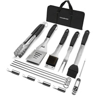• Q: What is included in the HAUSHOF Large Grilling Accessories set? A: The HAUSHOF Large Grilling Accessories set includes 15 pieces: 1 spatula, 1 grill fork, 1 grill tong, 1 basting brush, 1 cleaning brush, 4 skewers, 4 corn holders, 1 thermometer, and 1 carry bag.