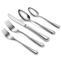 • Q: What design features does the flatware set have? A: The flatware features a simple and elegant bead pattern with a mirror finish.