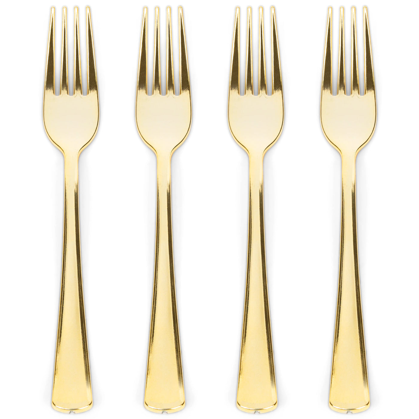 - Q: Do these forks come in other colors or sizes? A: This product listing specifically features gold plastic forks in a 7-inch size; other colors or sizes may not be available in this pack.