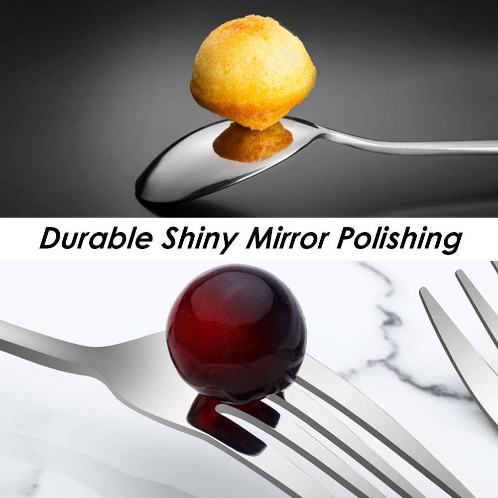 • Q: Do the utensils have a polished finish? A: Yes, the forks and spoons feature a smooth surface and a mirror polish that keeps them shiny and classy.