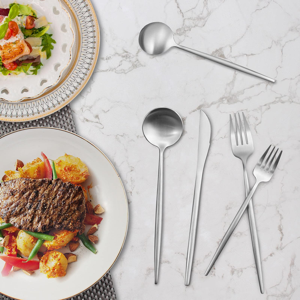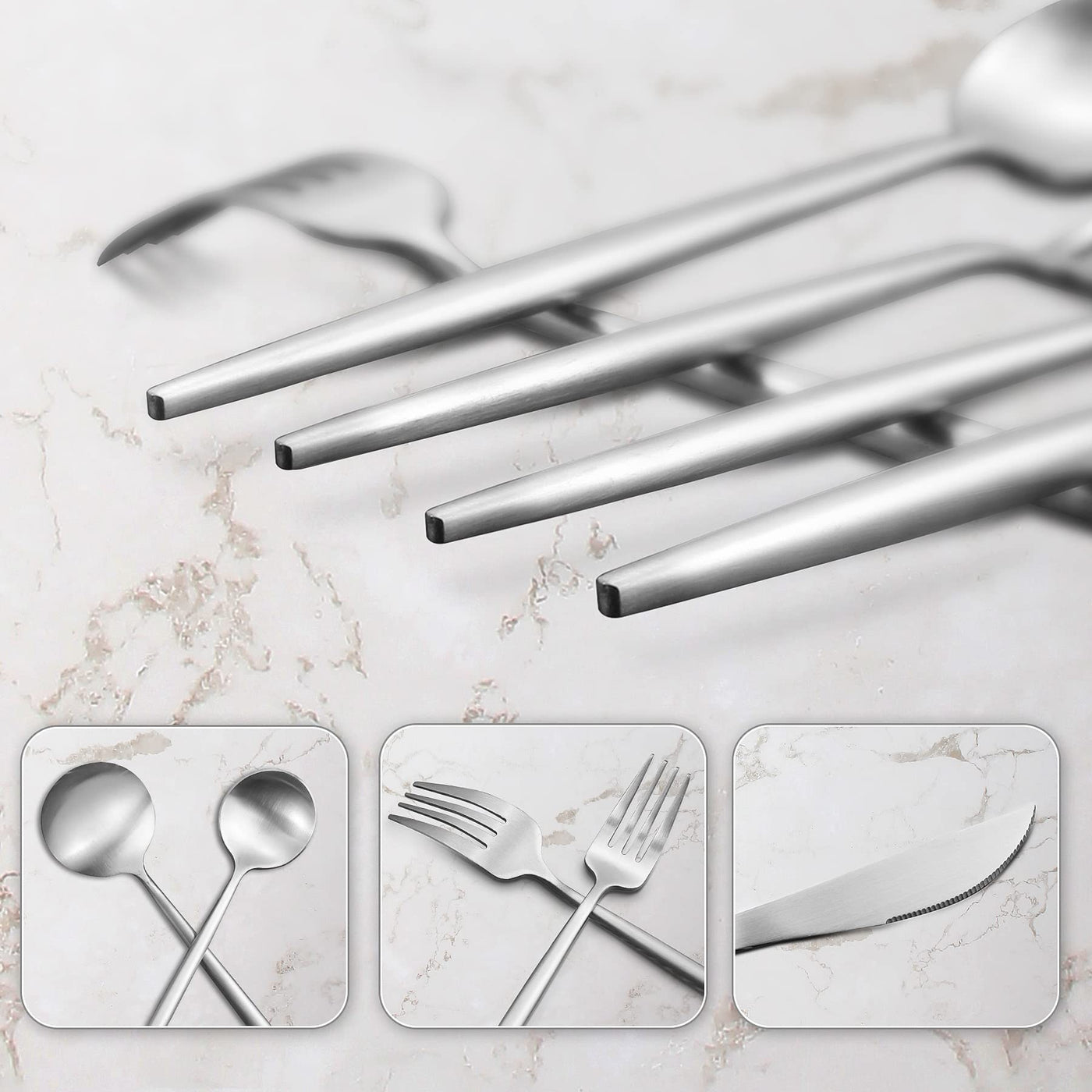 - Q: What style does the flatware set have? A: The flatware set features a modern and minimalist design with a matte finish, providing an elegant and sophisticated look.
