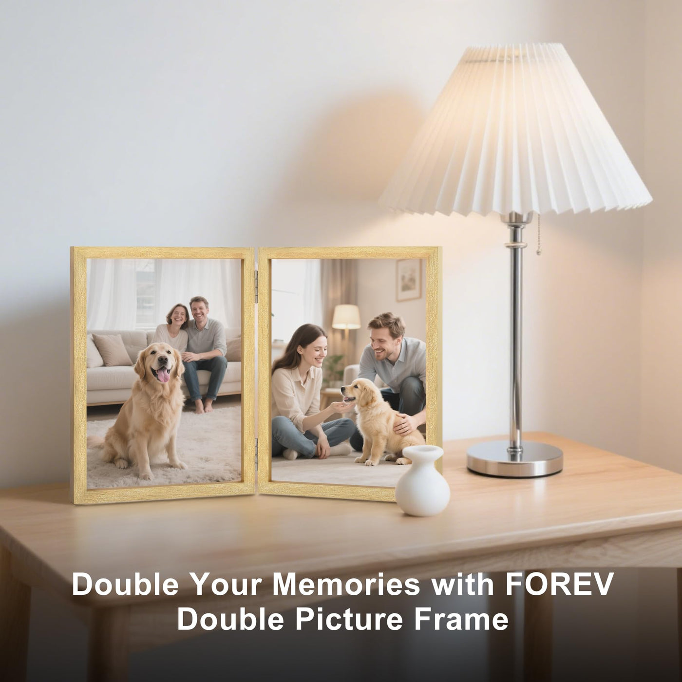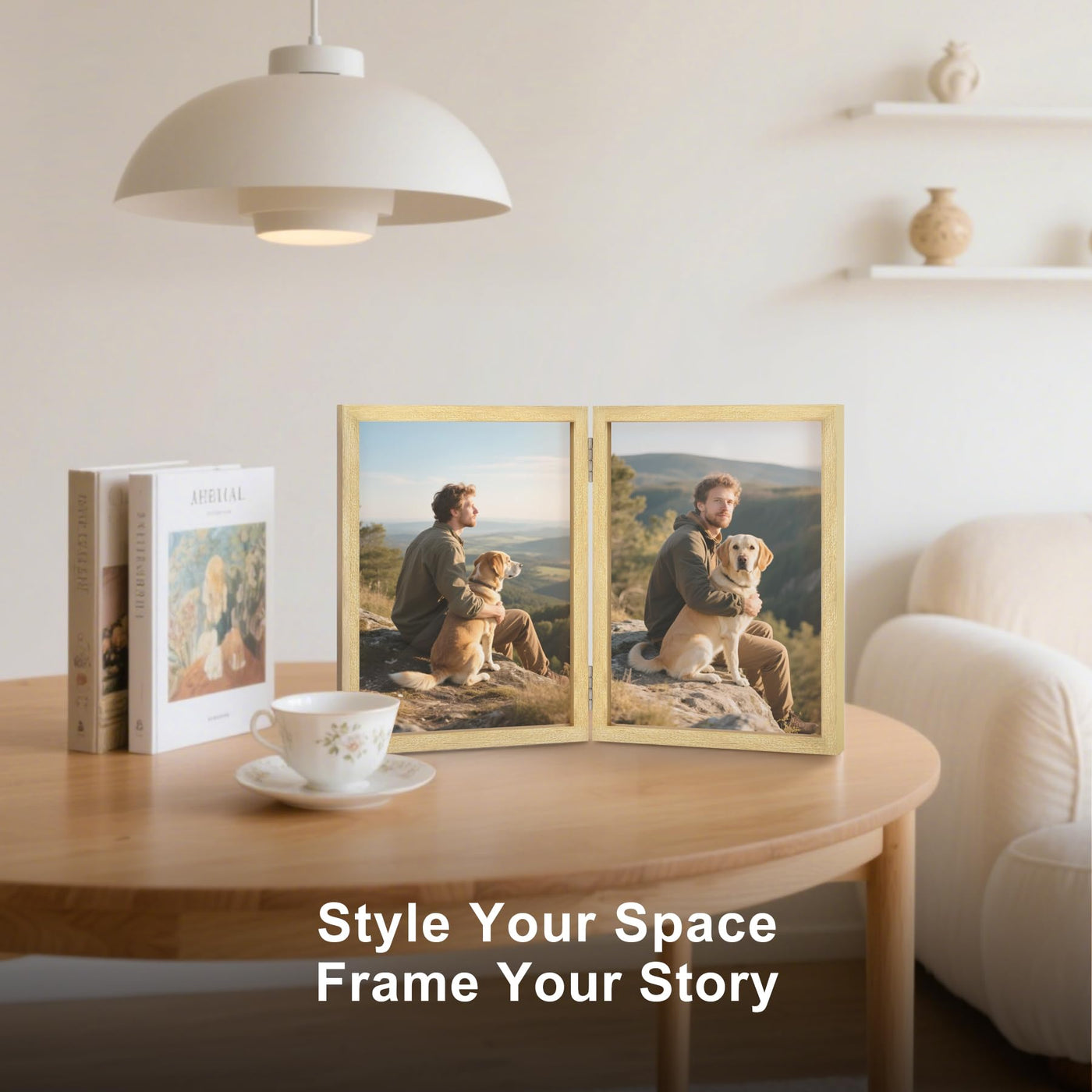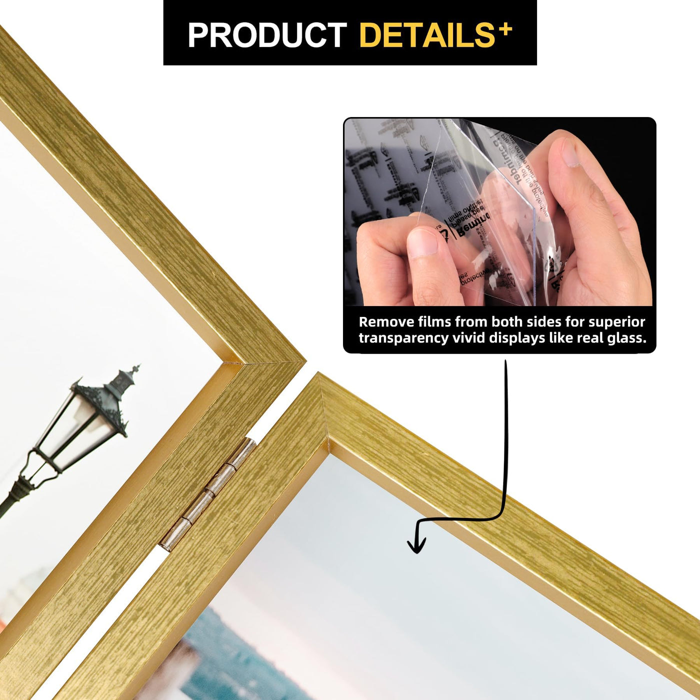 4x6 Double Picture Frame Wooden Hinged Photo Frame Definition Glass Stand Vertically on Desktop or Tabletop Gold