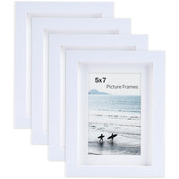 4 Pack 5 x 7 White Picture Frames: Display pictures 4 x 6 inch with mat or 5 x 7 inch without mat. Mat include. | Material: 100% made of natural Solid Wood, traditional craftsmanship, environmental paint. Hight quality High definition organic glass(polymethyl methacrylate ), NOT REAL GLASS!!! Shatterproof, Durability and Not fragile. | For Wall and Table: Hang on the wall as vertical or horizontal, or use the included folding stand to place on a table or desk. Hanging hardware included. Comes with easy opening tabs at the back for easy access. | Decorative: Place or hang photo frames in anywhere you want that to add warm, stylish or vintage and etc. Perhaps, create a photo wall, decorate your home or office. | Perfect Packing: Packaged in box to ensure it arrives safely ! Great for gift choose. If you dont like the frames or if there was any issue. Welcome to contact us!