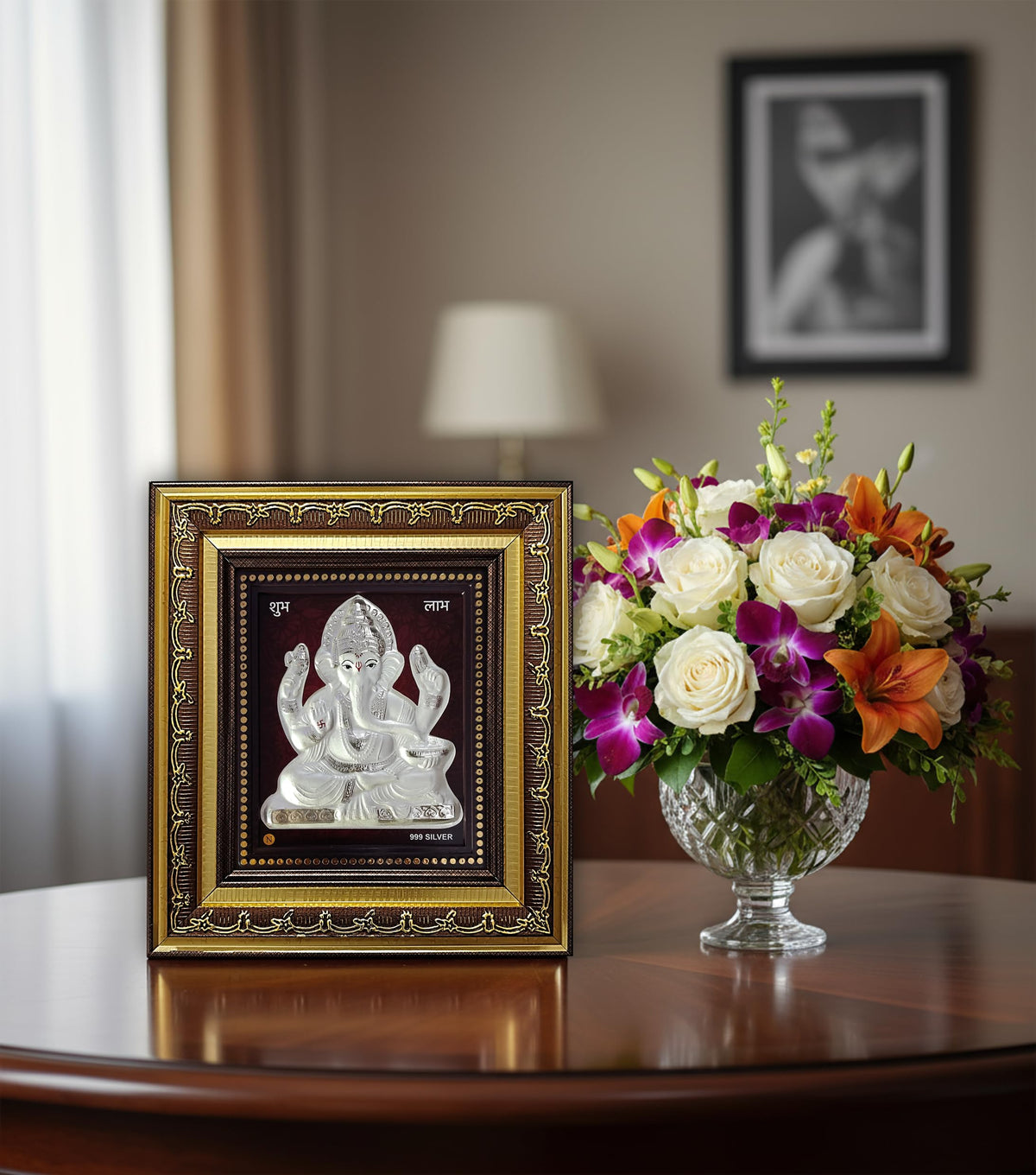 Artsmine 999 Silver Ganesh Rectangular Frame | Pooja Room Diwali Corporate Gift | Size H*L - 22 * 20 Cm | Wall Mount Ganesh Phot