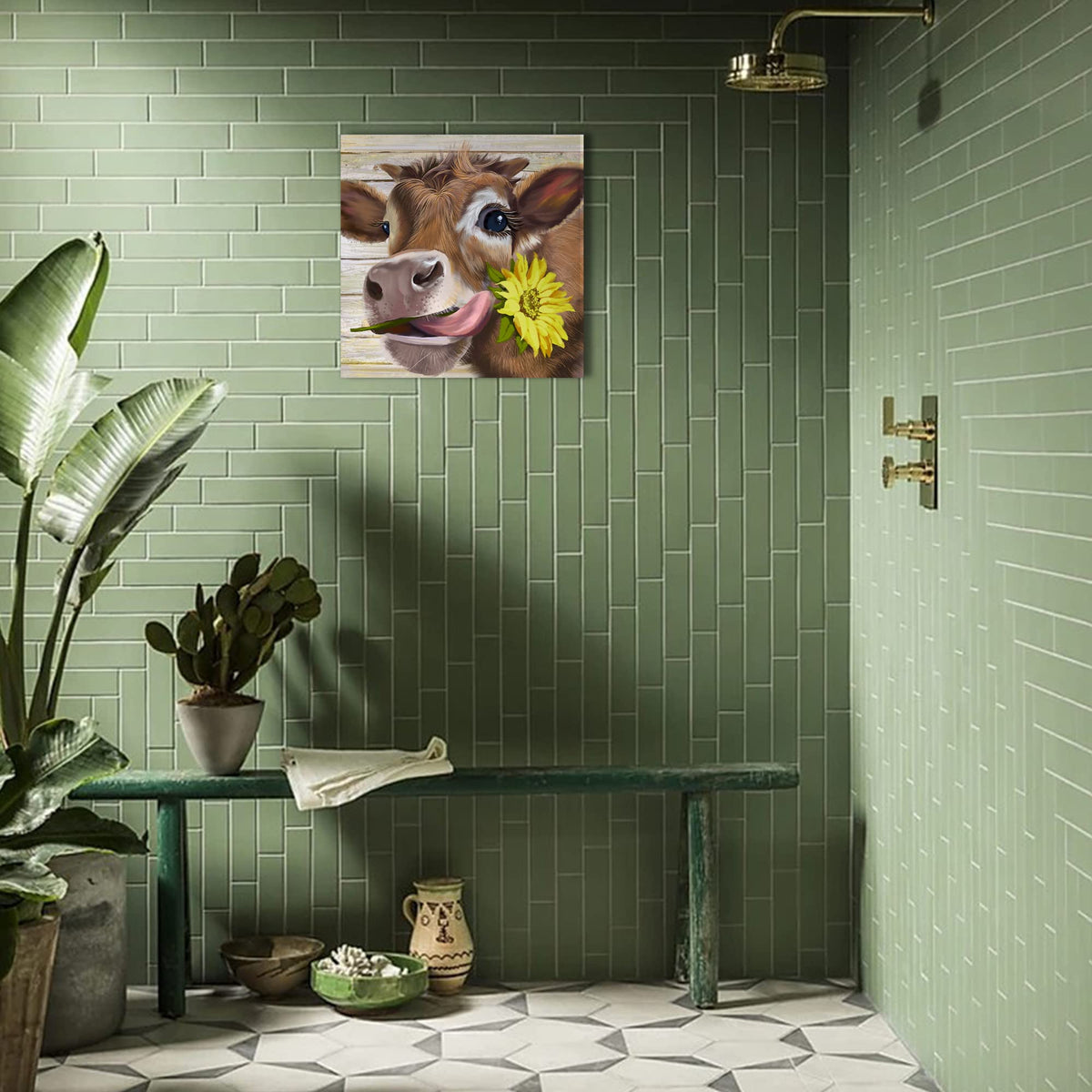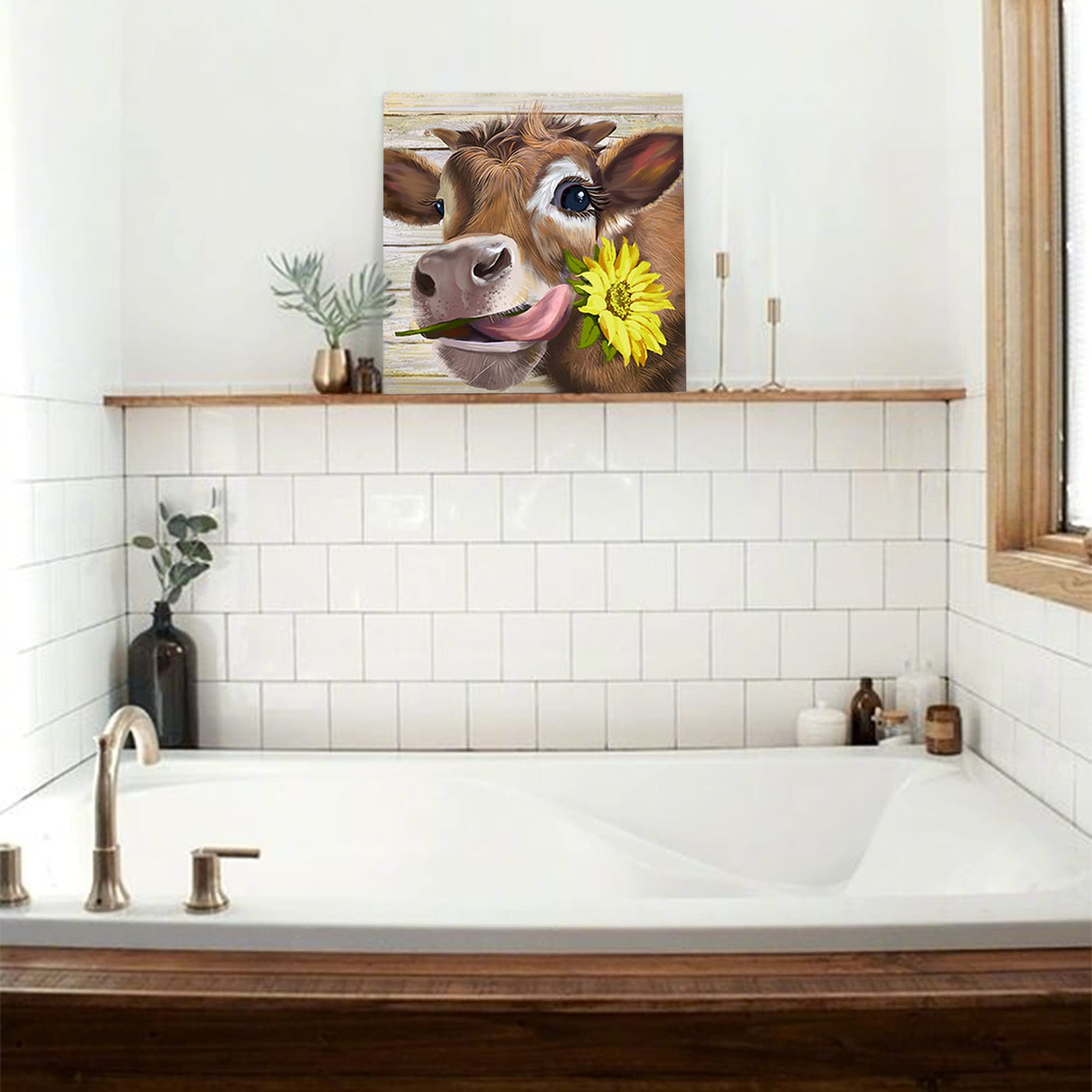 • Q: What themes or styles does this wall art represent? A: This canvas wall decor features a rustic farmhouse theme with a cute cow and sunflower, adding a charming touch to your space.