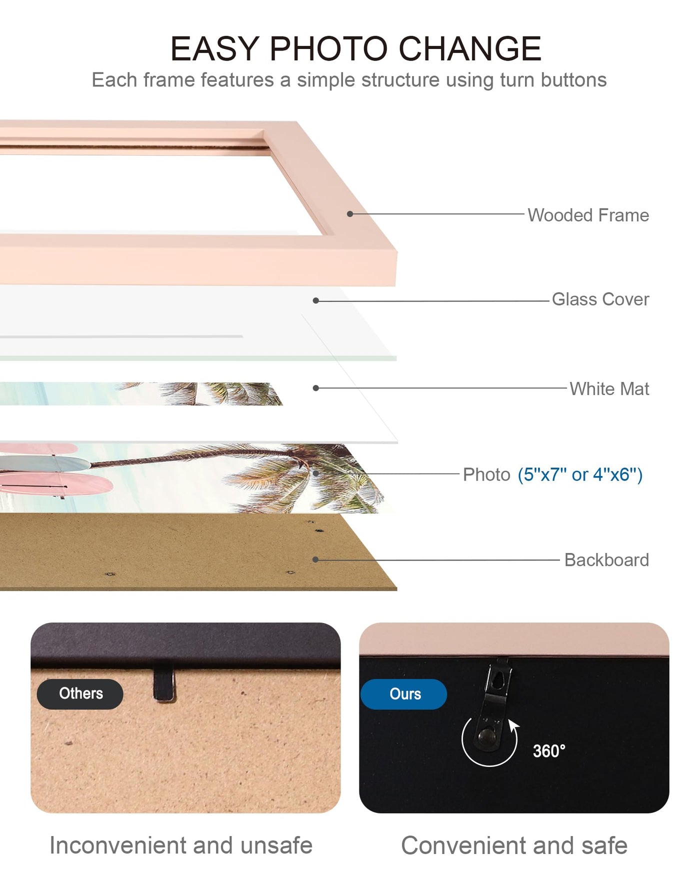 Sturdy Material and Glass: The 5 x 7 frame is made of sturdy wood rather than plastics, great looking and the mounting board is a durable MDF wood. with high-definition real glass cover. Provide you with a clear view. Perfect for displaying family photos, art, prints, or keepsake | One Frame Two Sizes: The 5x7 inch photo frame comes with a mat to display two sizes of photos for every need. This set of frames is suitable for 5x7 inch photos no mat or 4x6 inch photos with mat | Easy to Use! The frames 5x7 come with flexible swivel tabs on the back, Spring type action to remove the backing, without hurting fingers. It