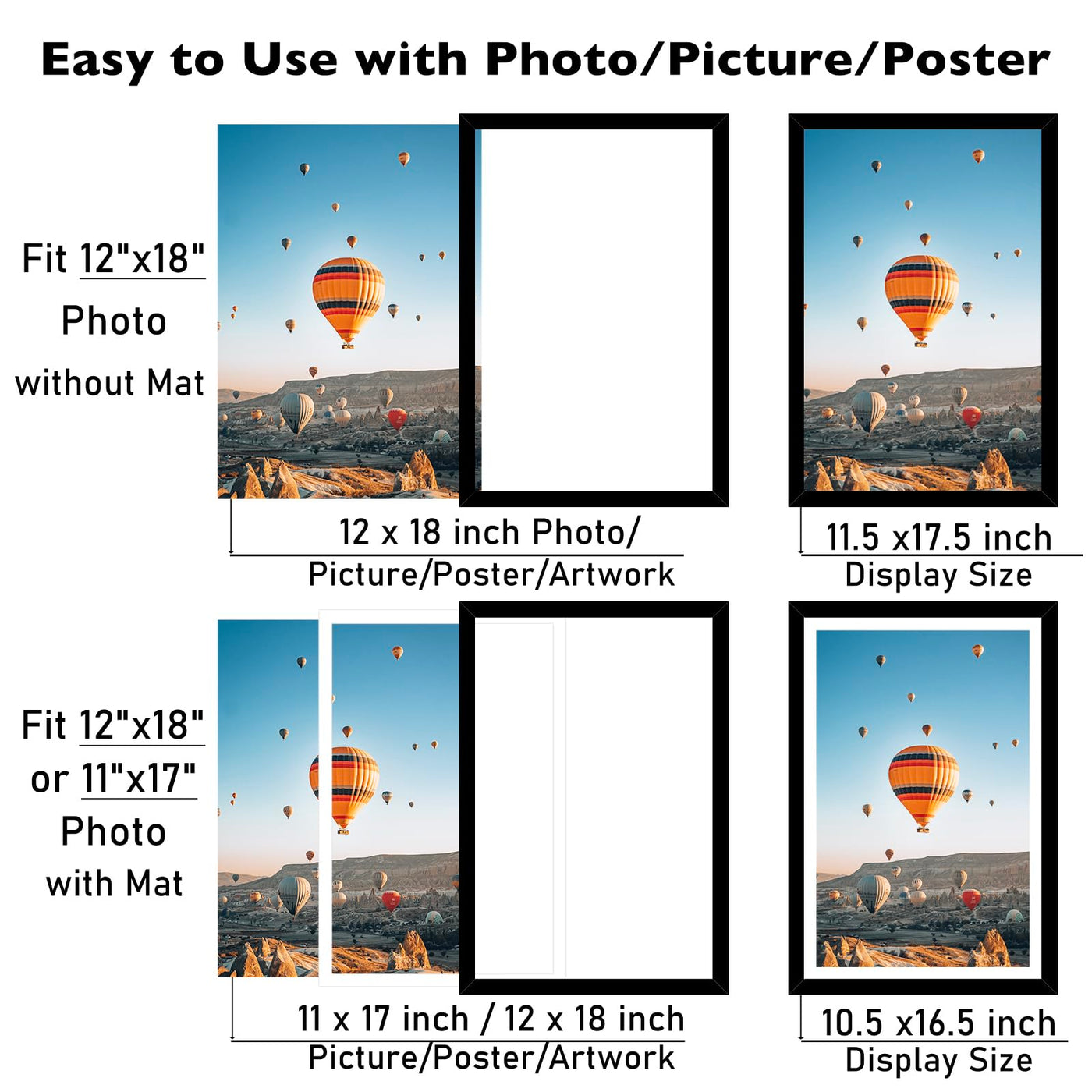 JCJMY 12x18 Picture Frame with 11x17 Mat, Display Photo 11x17 with Mat or 12 x 18 Without Mat, Wall Hanging Large 12 by 18 Poste