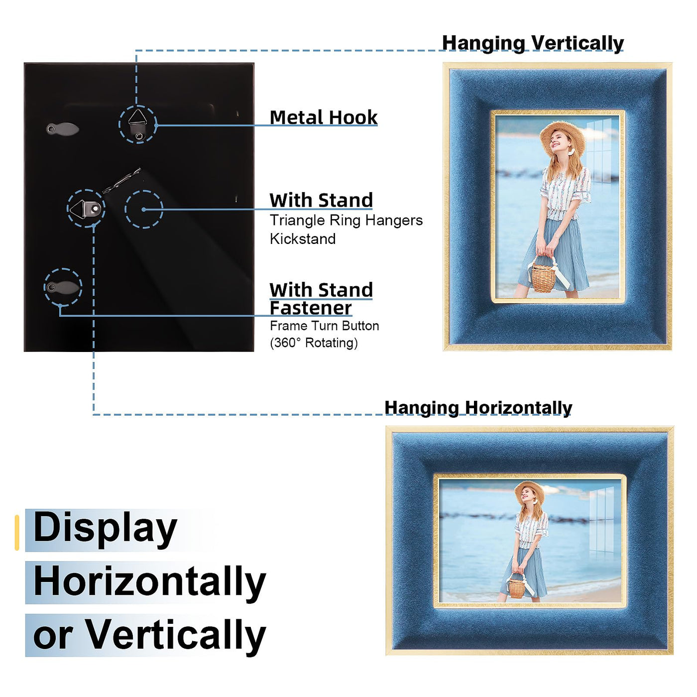 ?VELVET PICTURE FRAME?The Ksroecud 3.5x5 velvet picture frames is combined with a vintage navy blue velvet and metallic border, is a stunning frame that draws the eye to the beauty photo on display. These unique photo frames will add a punchline to your tabletop or wall decor, making your home or office more personal and captivating. | ?UNIQUE DESIGN?Our navy blue picture frame set includes 2 well-built frames. The look of the raised velvet border area surrounded by the metallic inner and outer edge of the frame and highlights the beauty of your pictures. The HD real glass clearly displays your wonderful moments, perfect to keep your cherished memories with your family or friends. | ?EASY TO USE? This frame is intended to display 3.5x5 photos. The frame comes with hanging hardware installed on back to hanging horizontally or vertically to fit your space available, and come with turn buttons to painlessly swap out photos. | ?HD DESIGN and VELVET MATERIAL?Our frames are made of high definition real glass front cover, display your photos or artwork clearly and perfectly! The velvet has a soft, touchable feel and color of the flannelette is very advanced, will not appear very dull, giving a very amazing feeling. | ?USE OCCASION? This velvet photo frame is not only pair well with family photos/events, Christmas, anniversary, wedding, housewarming, best friend picture frames, but amazing decoration in your coffee shop, art gallery,and more. Gift this to your loved ones, will be the most precious and memorable gift.