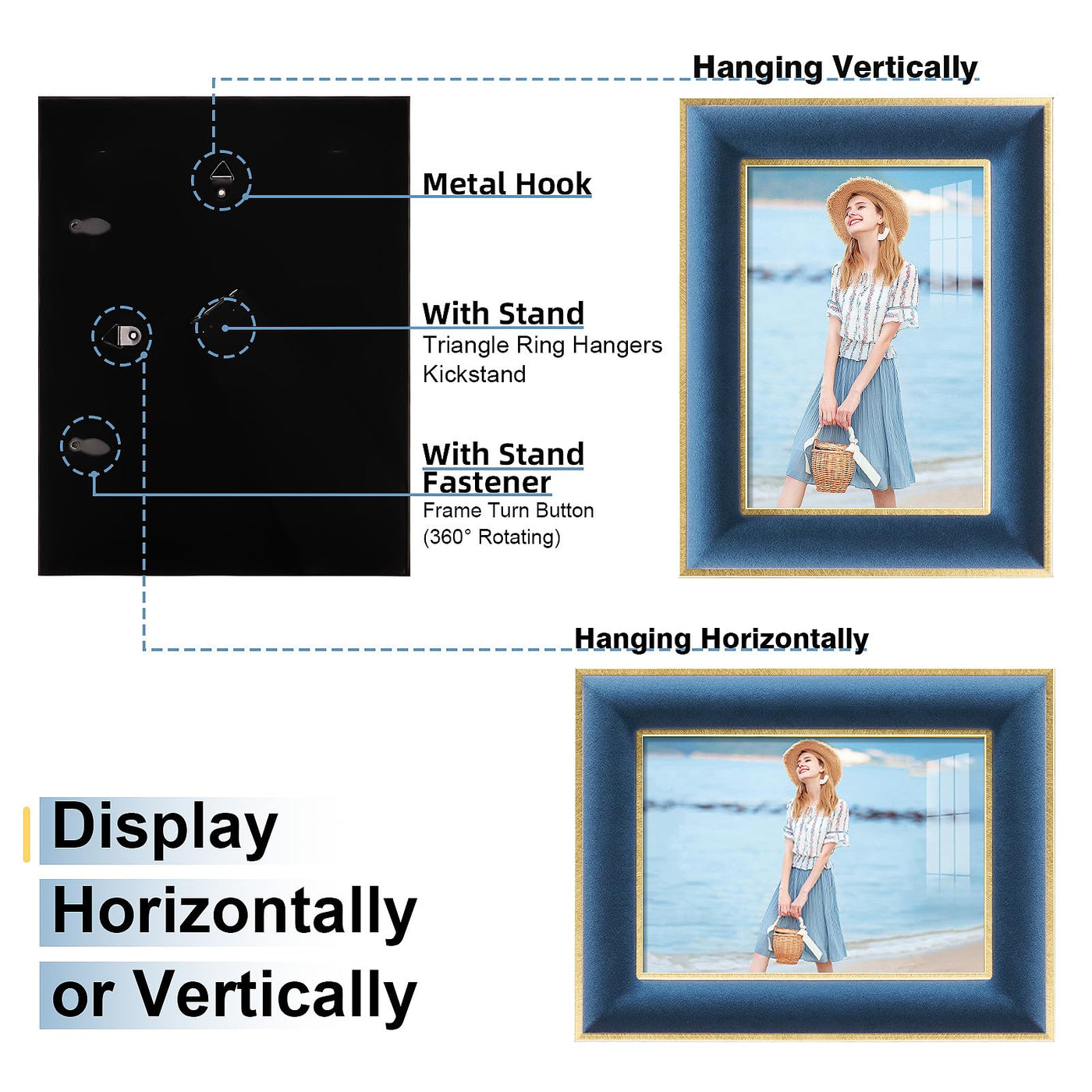 KSROECUD 5x7 Velvet Picture Frame, Navy Blue Photo Frames with Modern Simple Metallic Gold Border, HD Real Glass Horizontal & Ve