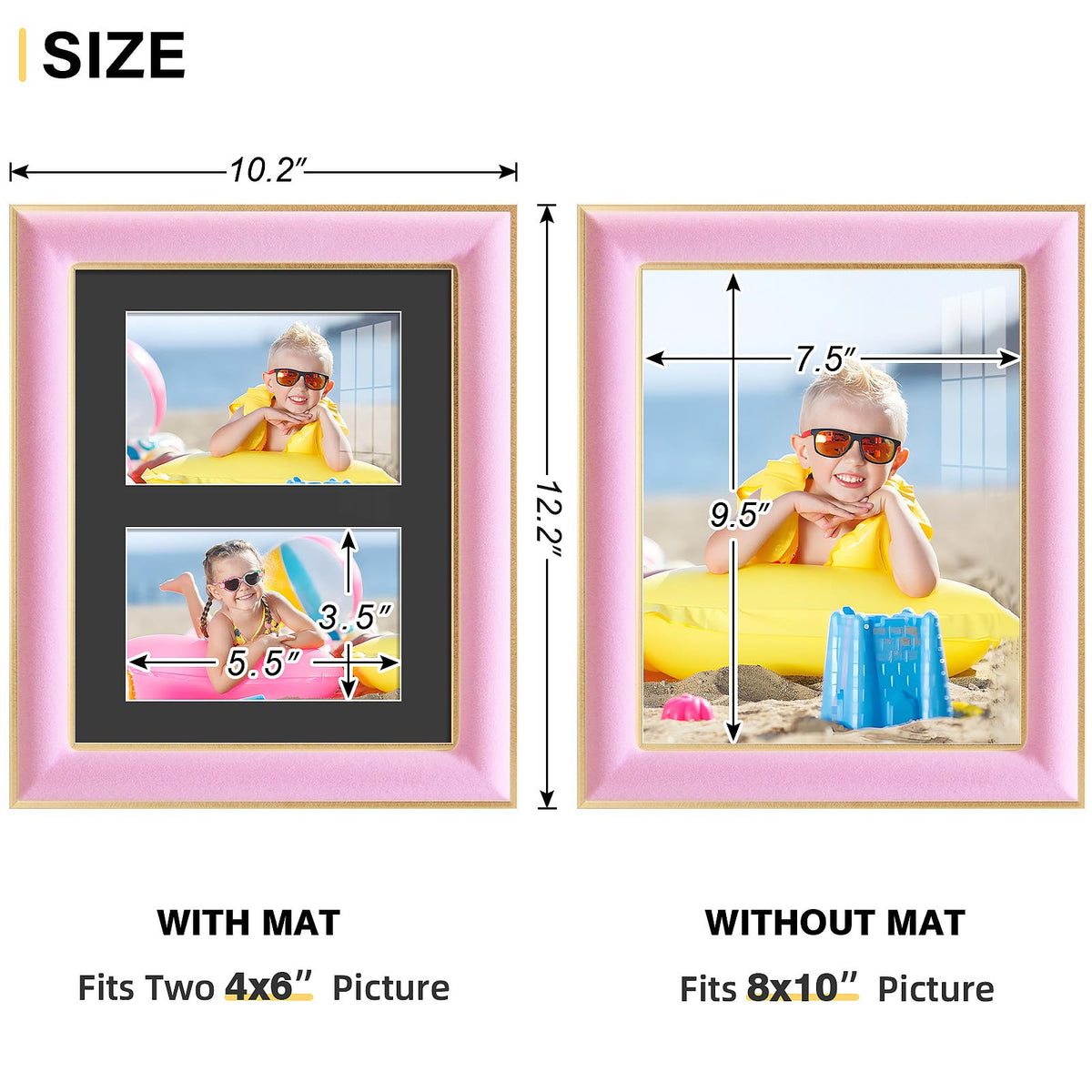 ?VELVET PICTURE FRAME?The Ksroecud 8x10 velvet picture frames with 2 Openings 4x6 Pictures that is combined with a vintage pink velvet and metallic border, black with white border mat is a stunning frame that draws the eye to the beauty photo on display. These unique photo frames will add a punchline to your tabletop or wall decor, making your home or office more personal and captivating. | ?UNIQUE DESIGN?Our pink picture frame set includes 2 well-built frames. The look of the raised velvet border area surrounded by the metallic inner and outer edge of the frame and highlights the beauty of your pictures. The HD real glass clearly displays your wonderful moments, perfect to keep your cherished memories with your family or friends. | ?EASY TO USE? This frame is intended to display 8x10 or 4x6 photos. The frame comes with hanging hardware installed on back to hanging horizontally or vertically to fit your space available, and come with turn buttons to painlessly swap out photos. | ?HD DESIGN and VELVET MATERIAL?Our frames are made of high definition real glass front cover, display your photos or artwork clearly and perfectly! The velvet has a soft, touchable feel and color of the flannelette is very advanced, will not appear very dull, giving a very amazing feeling. | ?USE OCCASION? This velvet photo frame is not only pair well with family photos/events, Christmas, anniversary, wedding, housewarming, best friend picture frames, but amazing decoration in your coffee shop, art gallery,and more. Gift this to your loved ones, will be the most precious and memorable gift.
