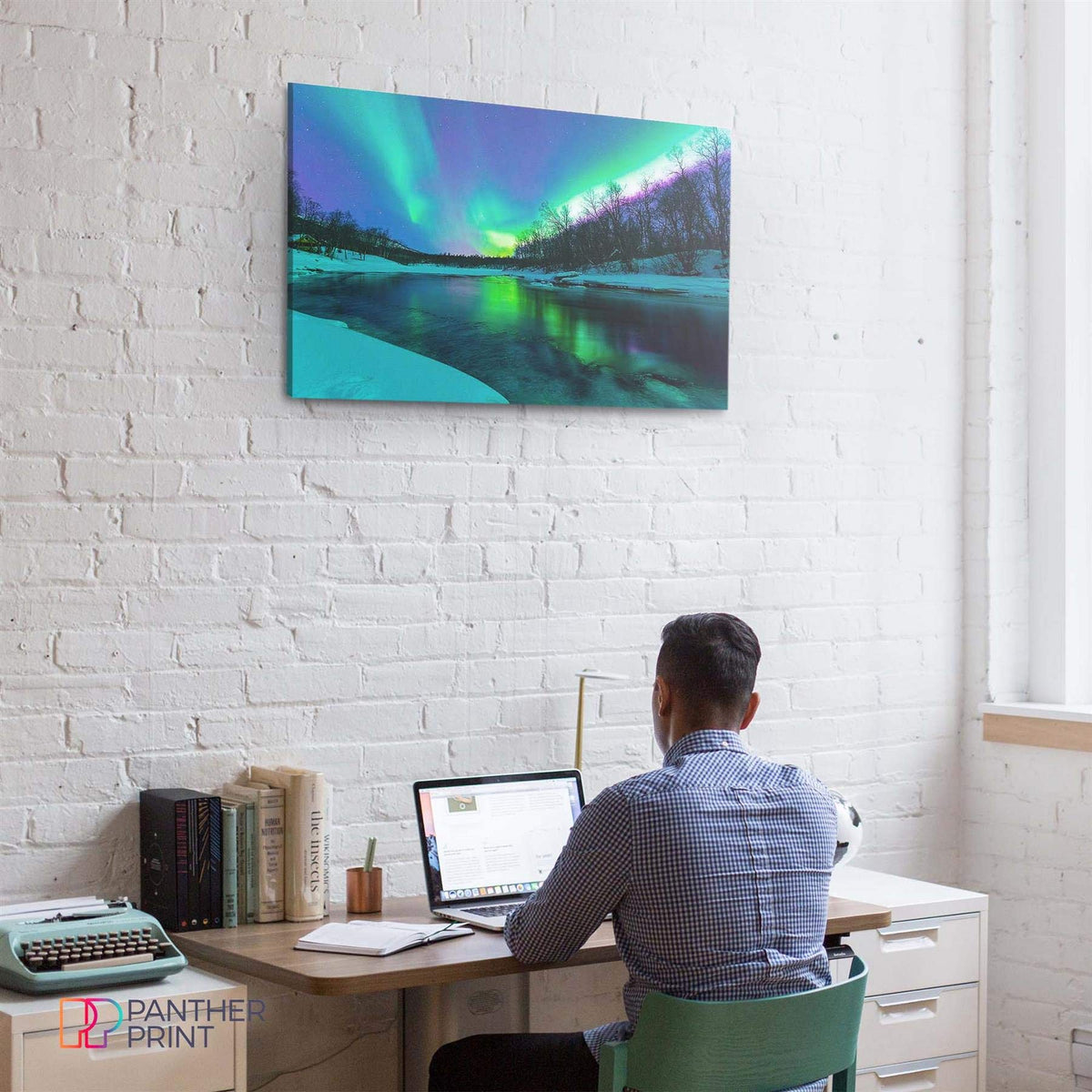 - Q: What style is the Panther Print Canvas Wall Art? A: The artwork features a nature design with a panther print, showcasing the winter river and northern lights, ideal for any modern decor.