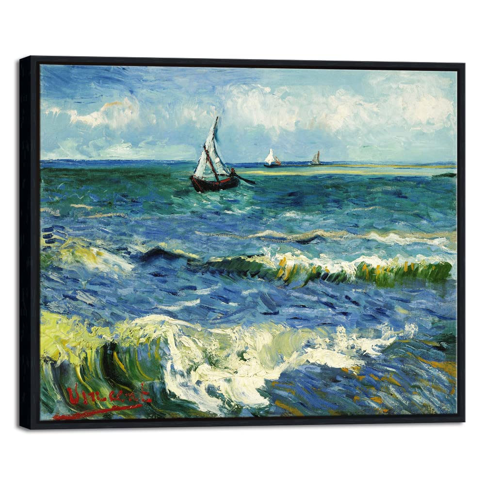 Wieco Art Black Framed Art Seascape At Saintes Maries By Vincent Van Gogh Oil Paintings Reproduction Modern Canvas Prints Sea Pi