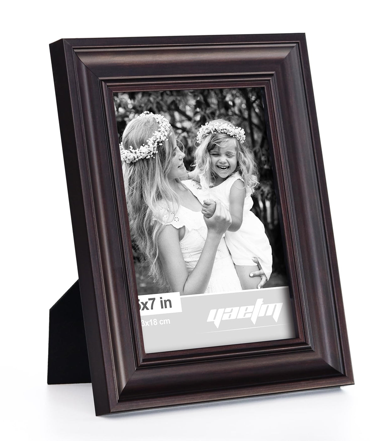 Size: 5 x 7 Inch | Color: Dark Brown | frame including: 4 pack YAETM frames is specialized in highest quality and creative photo frame more than 10 years. The frame is perfect to display your most cherished pictures and photos, lighten up your home or office. Frame Material: Plastic Surface Cover Material: Tempered glass Frame Display: Tabletop & Wall Mounting Frame Orientation: horizontal or vertical Care and Cleaning: Wipe Clean Frame Dimensions: 7.5 x 9.5 Assembly Details: no assembly required Total number of images held: 1 Home Placement: Table & wall Standard Image Size Held: 5x7 inch