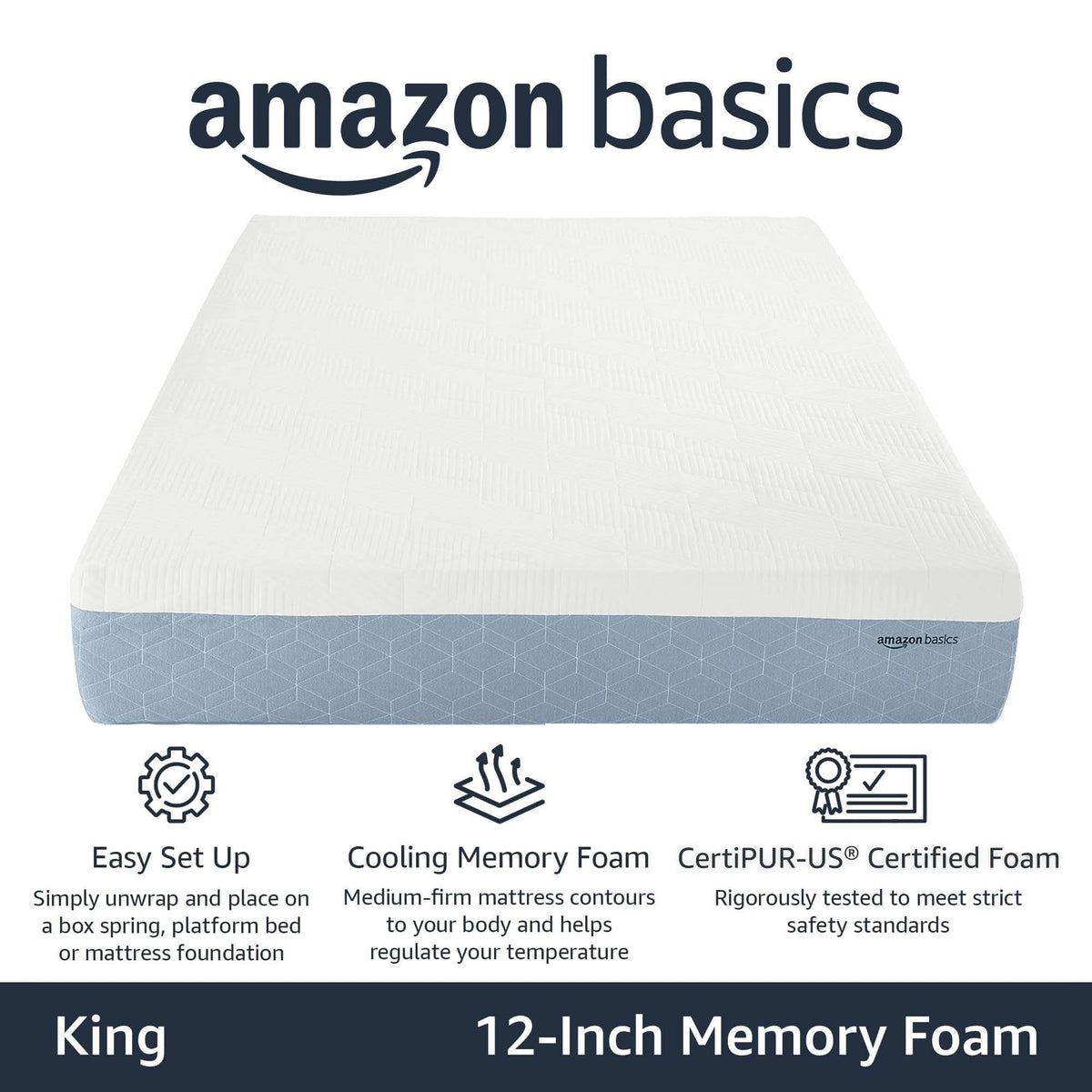 Amazon Basics Memory Foam Mattress, Medium Firm, Cooling Gel, King Size Mattress, Certipur-Us Certified Foam, 80 X 76 X 12 Inche