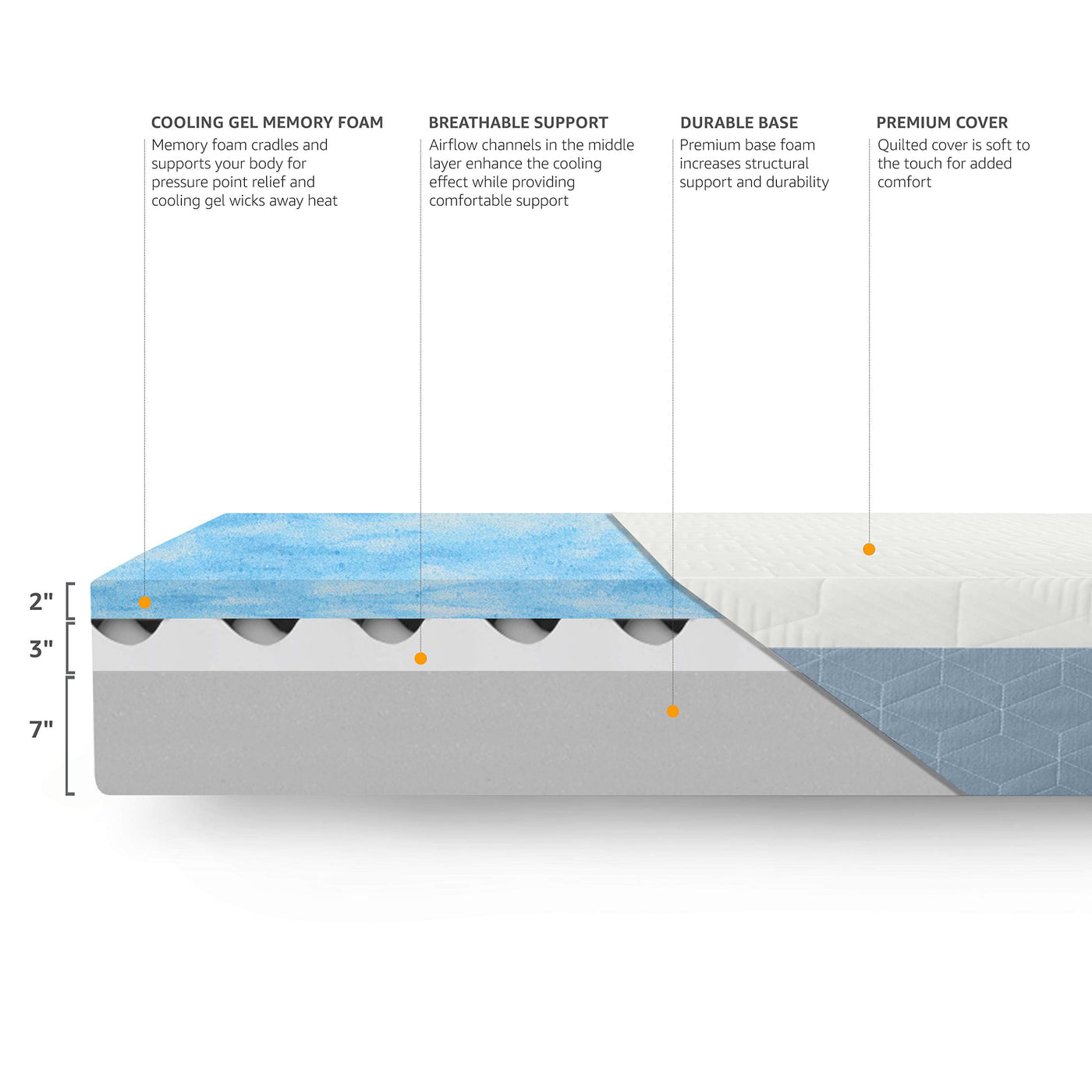 - Q: What materials are used in the Amazon Basics Memory Foam Mattress? A: The mattress features a three-layer hypoallergenic construction, including a cooling gel foam top layer, a breathable middle layer with airflow channels, and a supportive firm base.