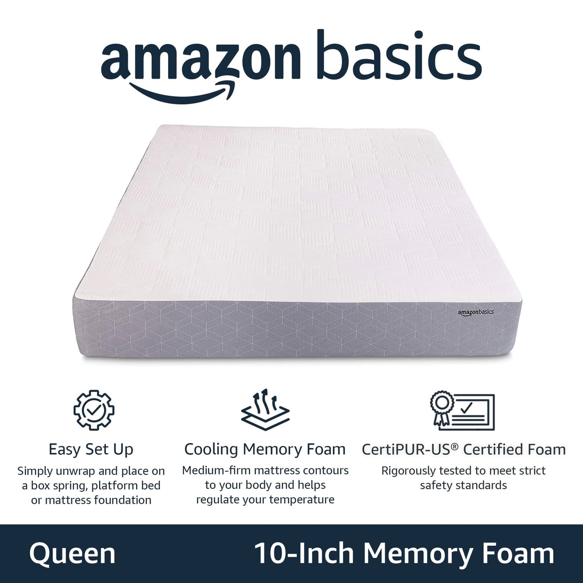 Amazon Basics Memory Foam Mattress, Medium Firm, Cooling Gel, Queen Size Mattress, Certipur-Us Certified Foam, 80 X 60 X 10 Inch