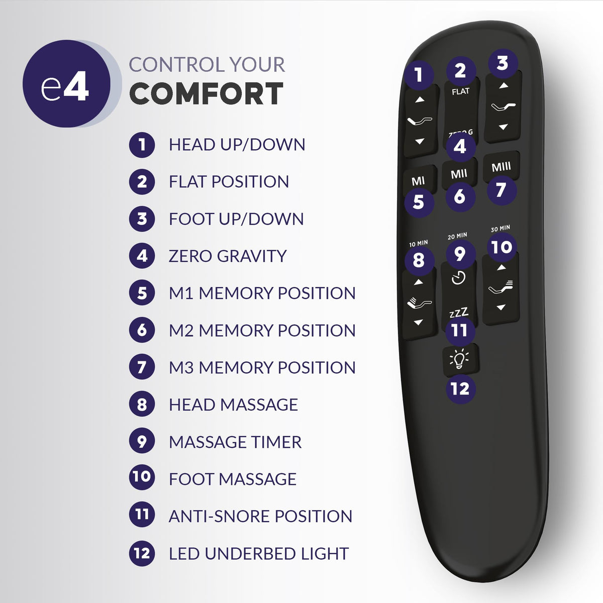 - Q: What is included in the Blissful Nights e4 Full Adjustable Bed Base set? A: The set includes the e4 adjustable bed base and a 12 inch Copper and Gel Infused Medium Firm Memory Foam Mattress.
