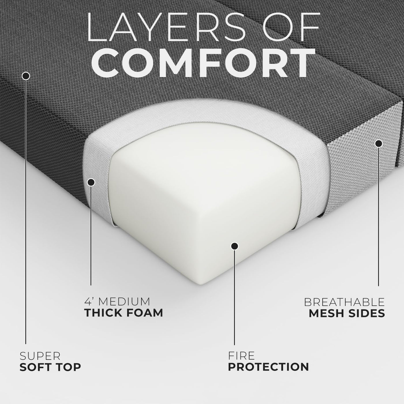 • Q: How thick is the mattress when fully unfolded? A: The mattress is 4 inches thick when fully unfolded.