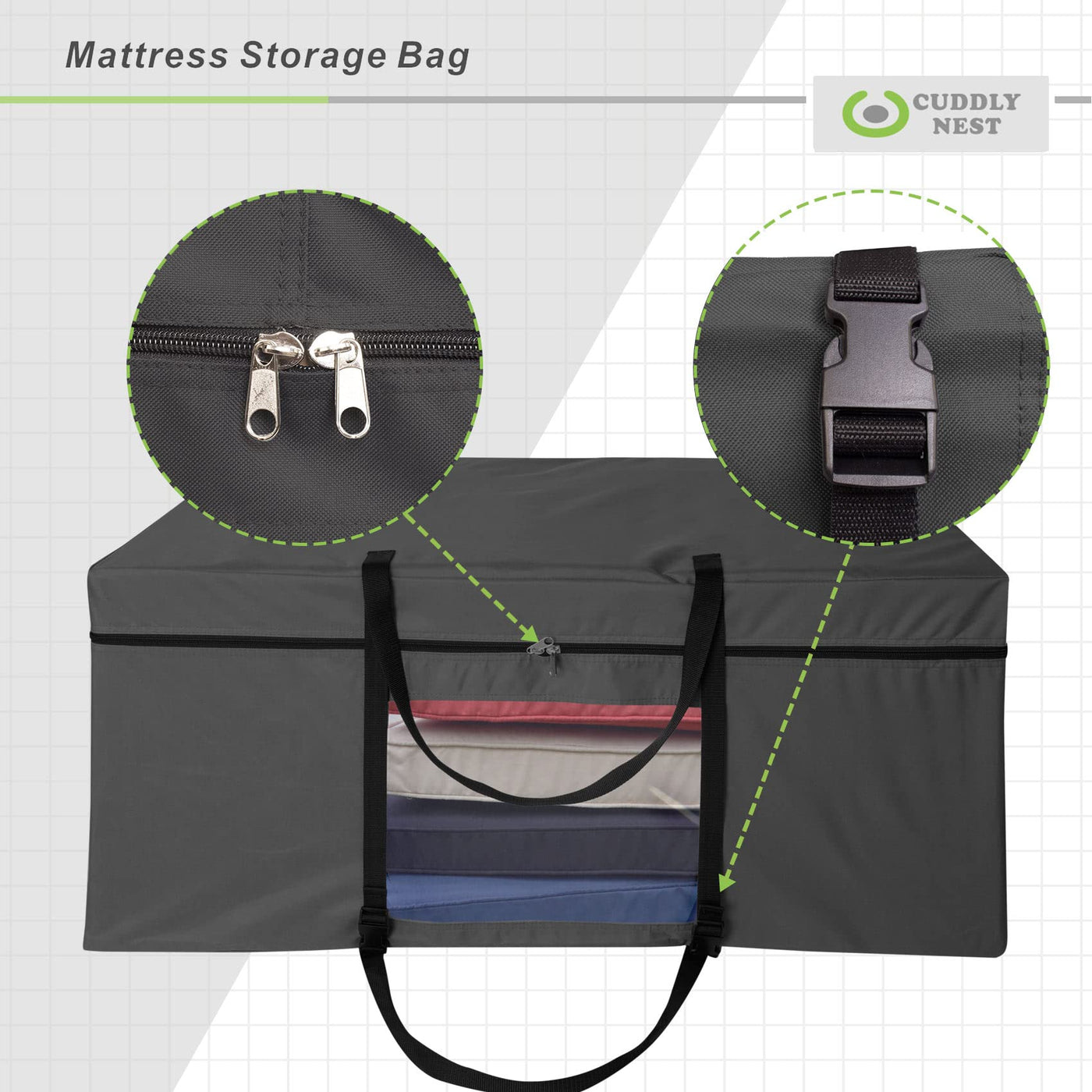 - Q: Does the bag have handles for easy carrying? A: Yes, the bag includes convenient carry handles stitched on three sides, making it easy to transport your mattress.