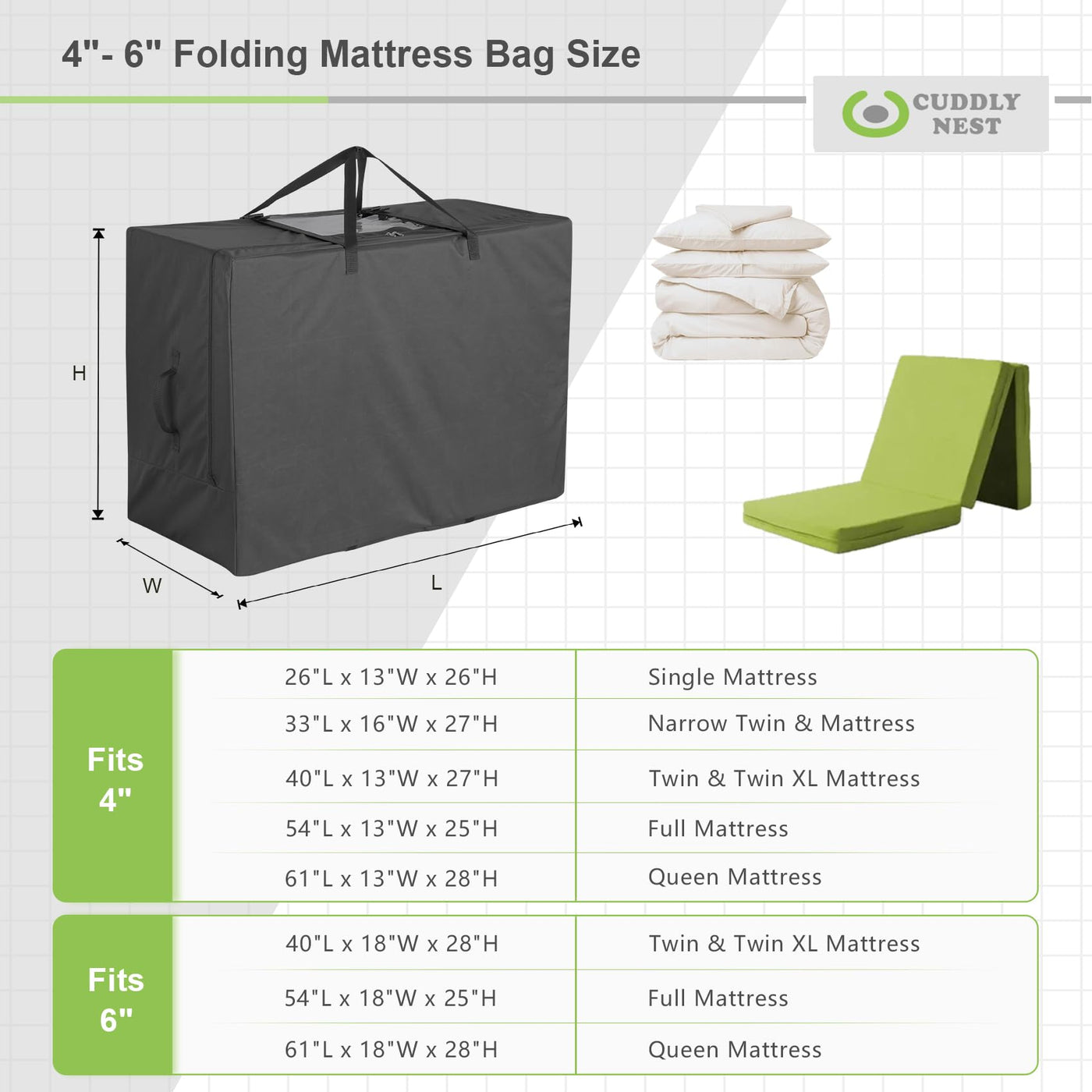 - Q: What size mattresses does the Cuddly Nest Folding Mattress Storage Bag fit? A: The Cuddly Nest Folding Mattress Storage Bag fits mattresses up to 6 inches thick, including Twin and Twin XL sizes.