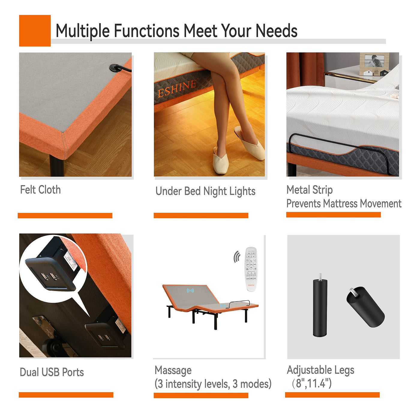 - Q: What features does the ESHINE Adjustable Bed Frame offer? A: This bed frame includes an ergonomic head and foot incline option, full body massage with three intensity levels, wireless remote control, adjustable leg height, dual USB ports, and under-bed lighting.