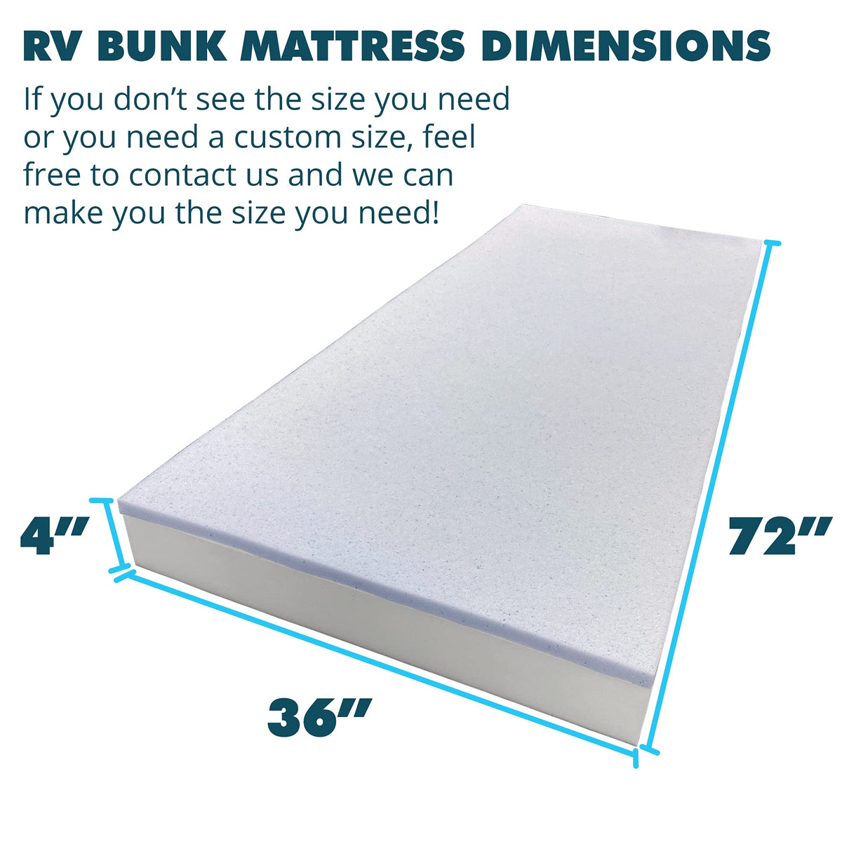 - Q: What are the dimensions of the Foamma RV Bunk Mattress? A: The Foamma RV Bunk Mattress measures 4 inches thick, 36 inches wide, and 72 inches long.