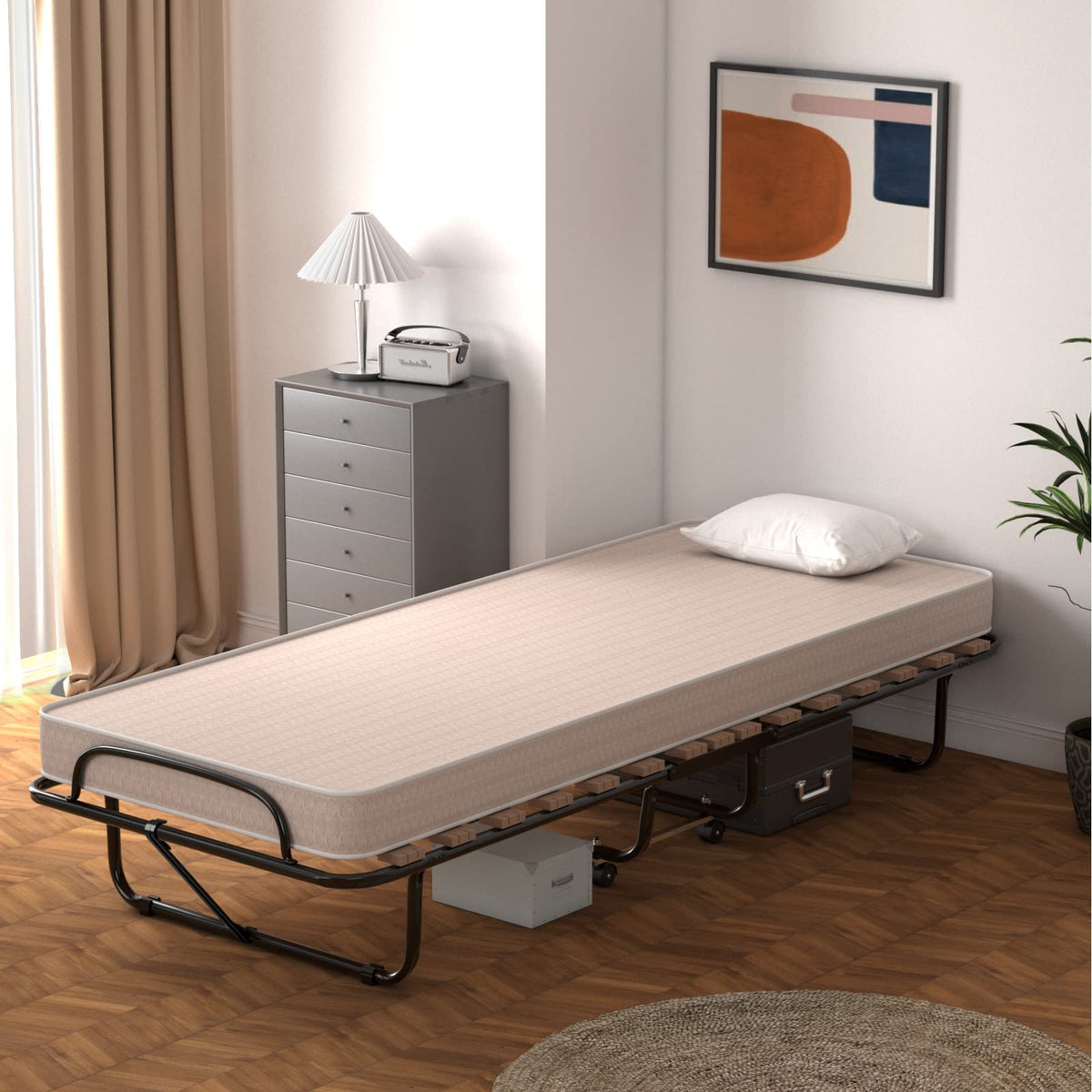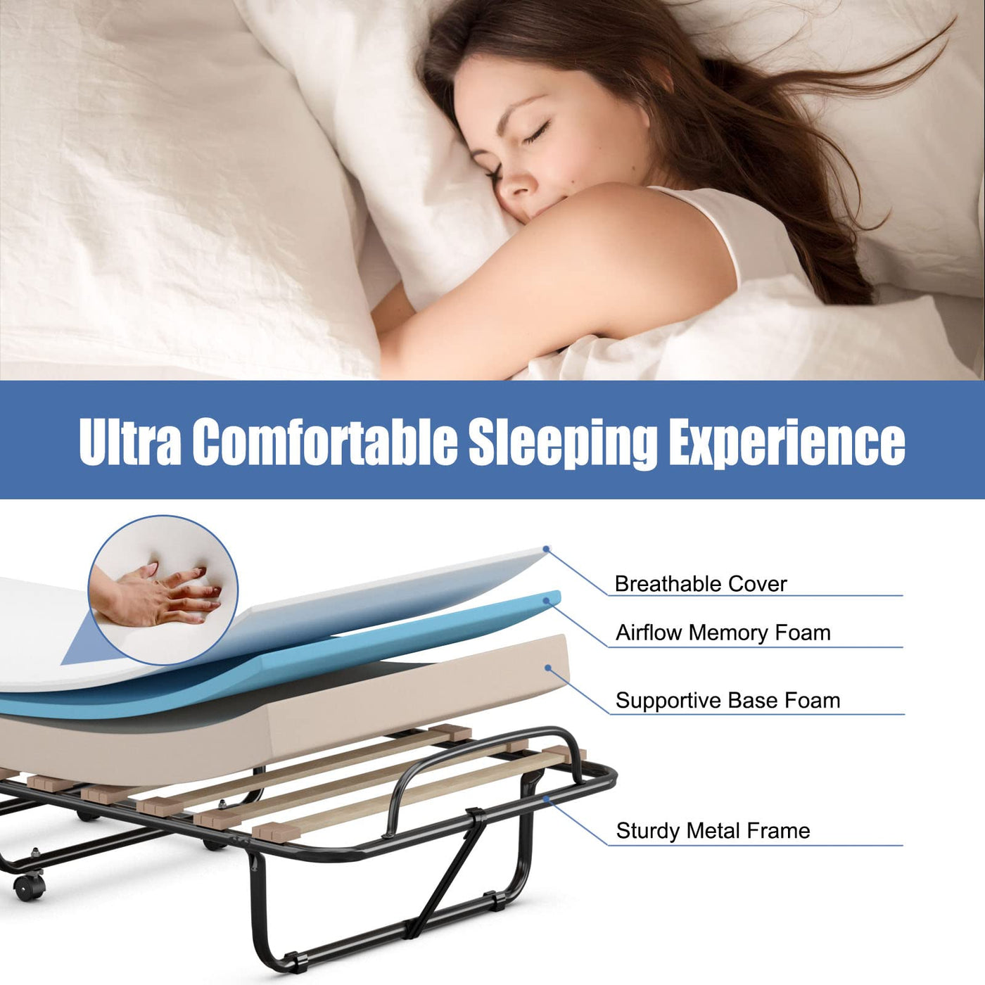 Giantex Folding Bed with Mattress for Adults Rollaway Guest Beds w/Memory Foam Mattress & Metal Frame Made in Italy Cot Size Rollaway Bed Portable Foldable Sleeper Bed for Home Beige