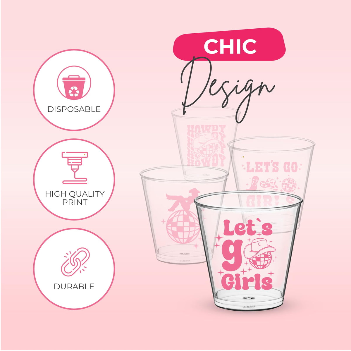 - Q: Do these shot glasses have any fun designs? A: Yes, they feature bold pink disco cowgirl prints with phrases like 'This Ain't My First Rodeo' and 'Howdy Howdy'.