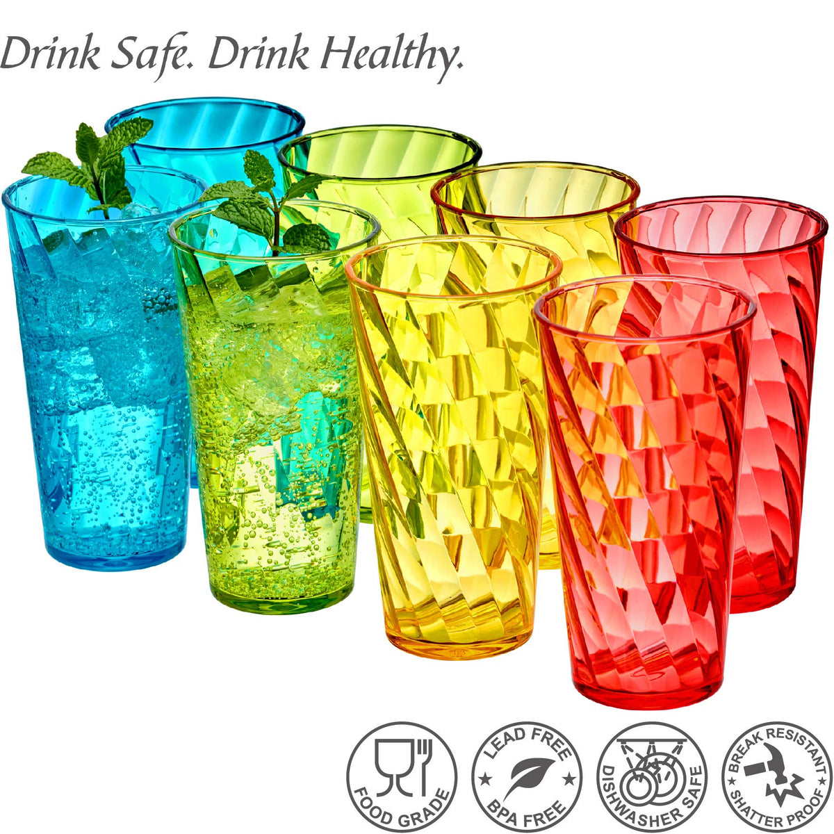 Amazing Abby - Glacier - 18-Ounce Plastic Tumblers (Set of 8) Plastic Drinking Glasses Mixed-Color High-Balls Reusable Plastic Cups Stackable BPA-Free Shatter-Proof Dishwasher-Safe