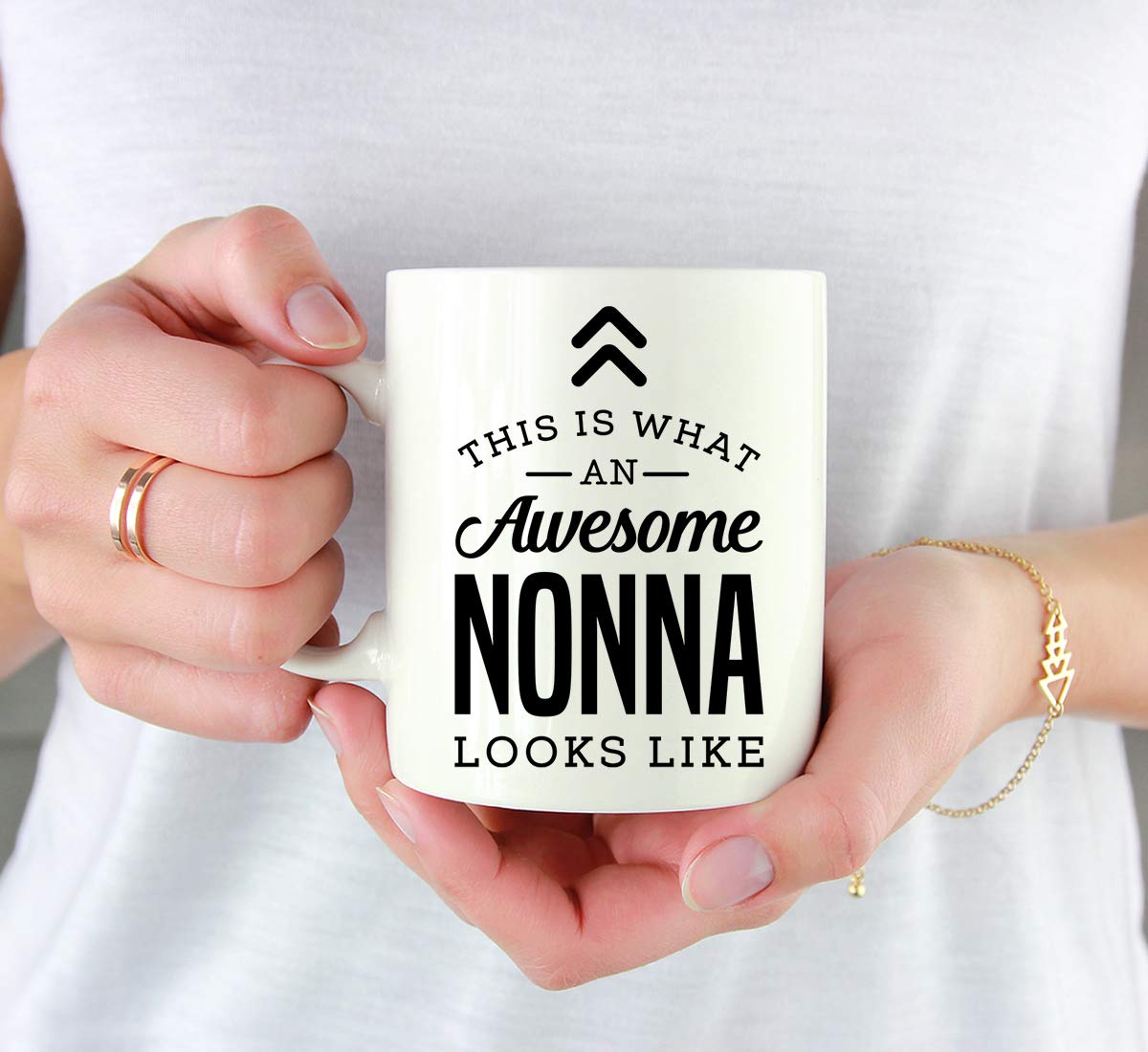 - Q: What design is printed on the mug? A: The mug features the phrase 'This is What an Awesome Nonna Looks Like' printed on both sides.