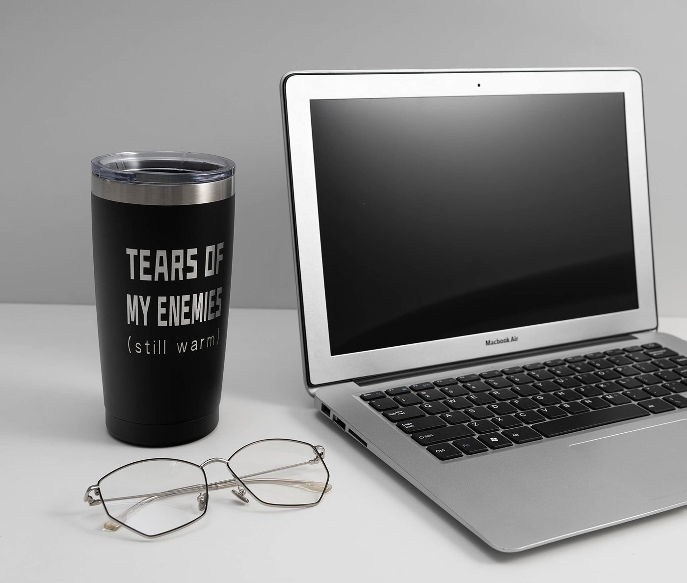 • Q: What is the design on the tumbler? A: The tumbler features a humorous engraved design that says 'Tears Of My Enemies'.