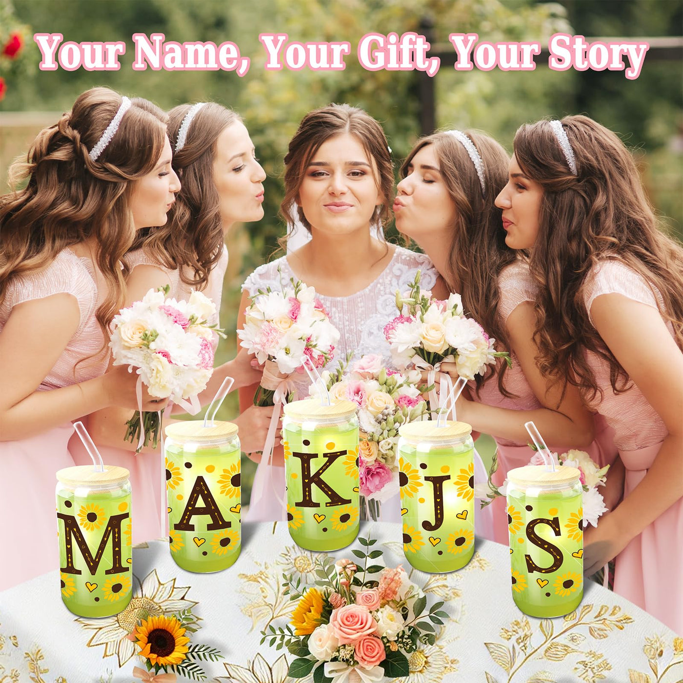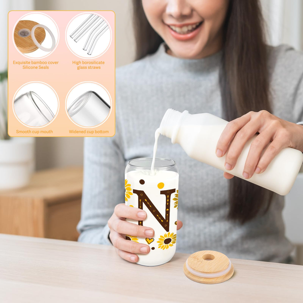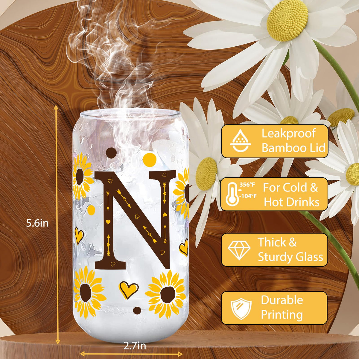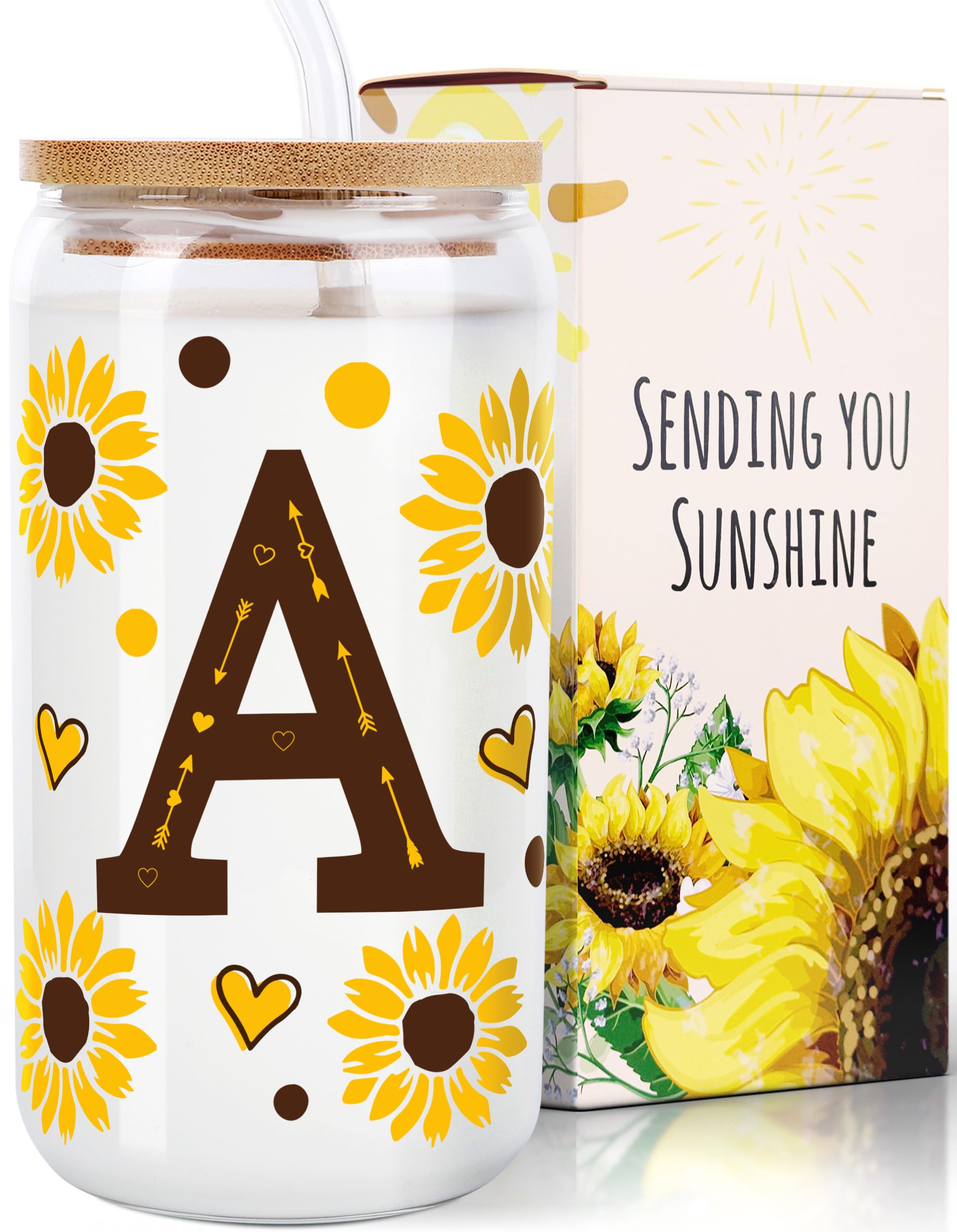 Experience the Charm of Sunflower Bliss Glass TumblerIntroducing the Sunflower Bliss Glass Tumbler, an enchanting blend of functionality and stunning aesthetics that elevates your everyday beverage experience. Adorned with a lively sunflower design, this tumbler is not just a drinkware item-its a symbol of joy and vitality. Perfect for daily use, it meets your drinkware needs from iced coffee in the morning to smoothies in the evening.Why Sunflower Bliss Stands Out:Personalization at its Best: These glass cups with lids and straws are not just practical; theyre a personal statement of style and preference. Ideal as personalized gifts for women, they resonate with anyone who values uniqueness and quality.Multipurpose Use: Use them as iced coffee tumblers in the morning or smoothie cups in the afternoon. Their versatility extends to serving as elegant glass cups for hosting or daily use, enhancing every sip with clarity and style.Built to Last: With robust construction and eco-friendly materials, these cups ensure a sustainable and durable choice. The thick glass is perfect for both hot and cold beverages, making these tumblers a reliable choice for every season.Gift-Ready Packaging: Although simply packaged in a standard box, these tumblers are perfect as Christmas Gifts for Women and Mothers Day gifts, offering beauty and functionality that any recipient would appreciate.Eco-Conscious Living: Embrace an eco-friendly lifestyle with these mason jar cups, designed to replace disposable cups and bottles. Their reusability ensures you enjoy your beverages while contributing to environmental conservation.