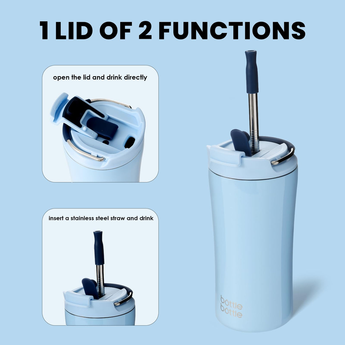 • Q: How does the dual-use lid work? A: The dual-use lid allows you to drink directly from the flip lid or insert a stainless steel straw for convenience.