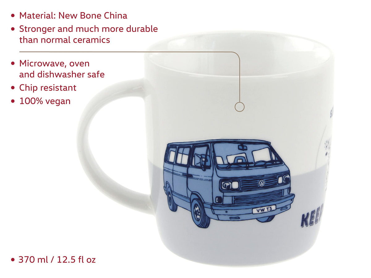 - Q: What design is featured on the mug? A: The mug features a blue VW T3 Bus design along with the lettering 'Keep Driving'.